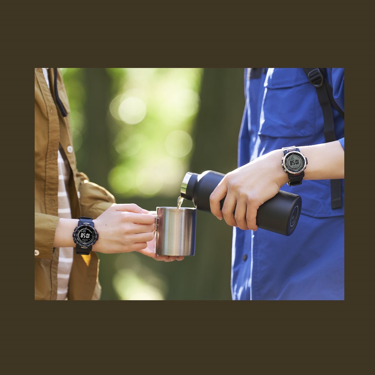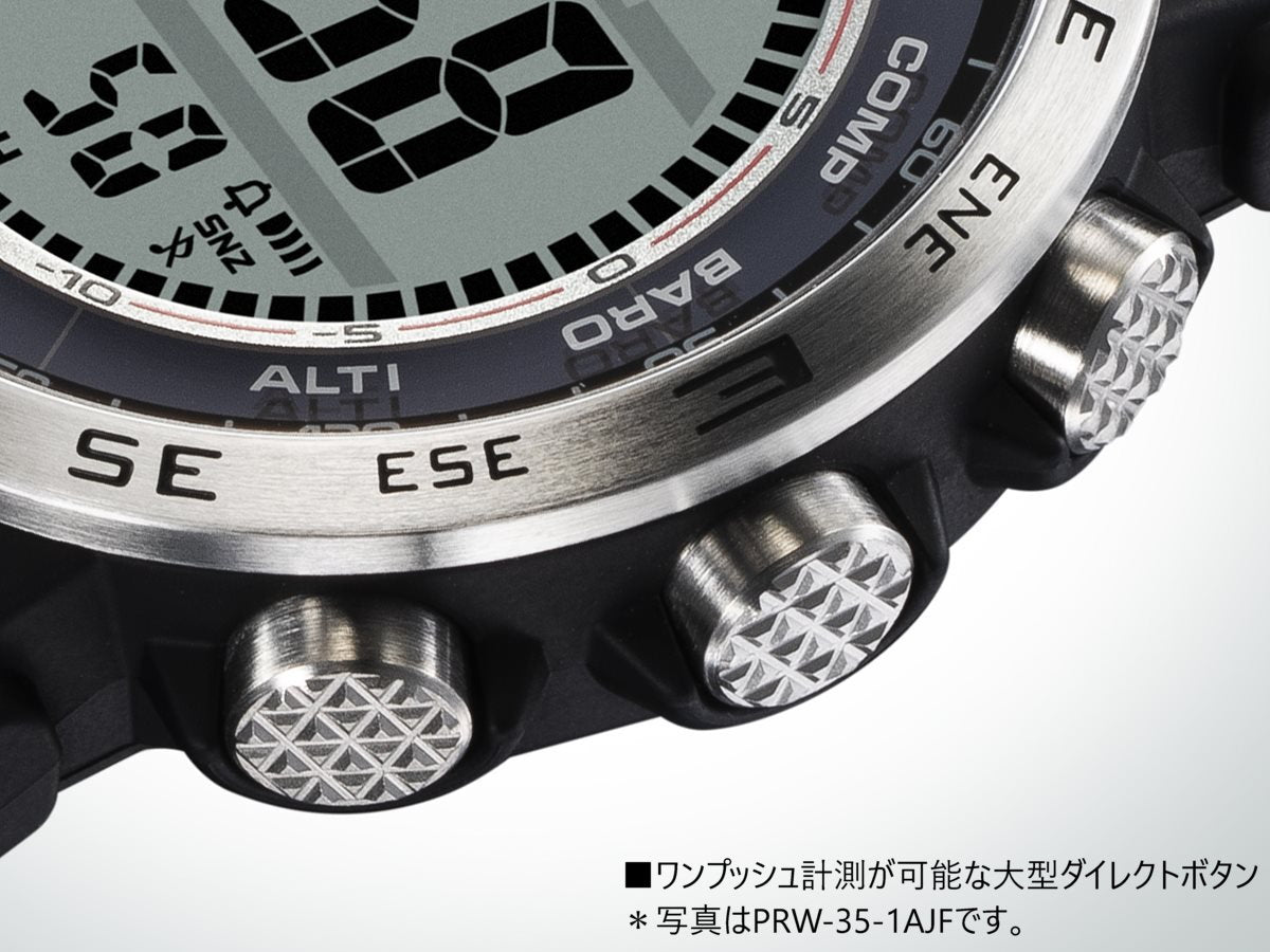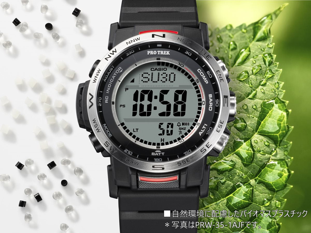 自然を愛する人の本格アウトドアギアPRO TREKクライマーラインから、環境に配慮されたエコ素材を採用し、直感的な操作が可能なデジタルモデルのPRW-35のご紹介です。バンドは、環境に配慮したバイオマスプラスチック素材のソフトウレタンバンドとなっています。ケースと樹脂製の裏蓋にもバイオマスプラスチックを使用し、軽量化を図りました。また、蒸れを防ぐスリット穴を設け腕への装着性を向上しました。時計右側に方位、気圧/温度、高度をワンプッシュで計測できる大型のダイレクトボタンを配し、計測結果を数値でデジタル表示。各ボタンの近くに、瞬時に機能を認識できるよう方位・気圧・高度を示す機能表記を採用し、過酷なアウトドアシーンにおいても、直感的に必要な情報を計測、把握できます。また、STN液晶やボールドフォントを採用し視認性を向上させています。計測機能に加えタフソーラーや電波受信機能、10気圧防水等の基本性能も搭載し、過酷なシーンでも使用できます。