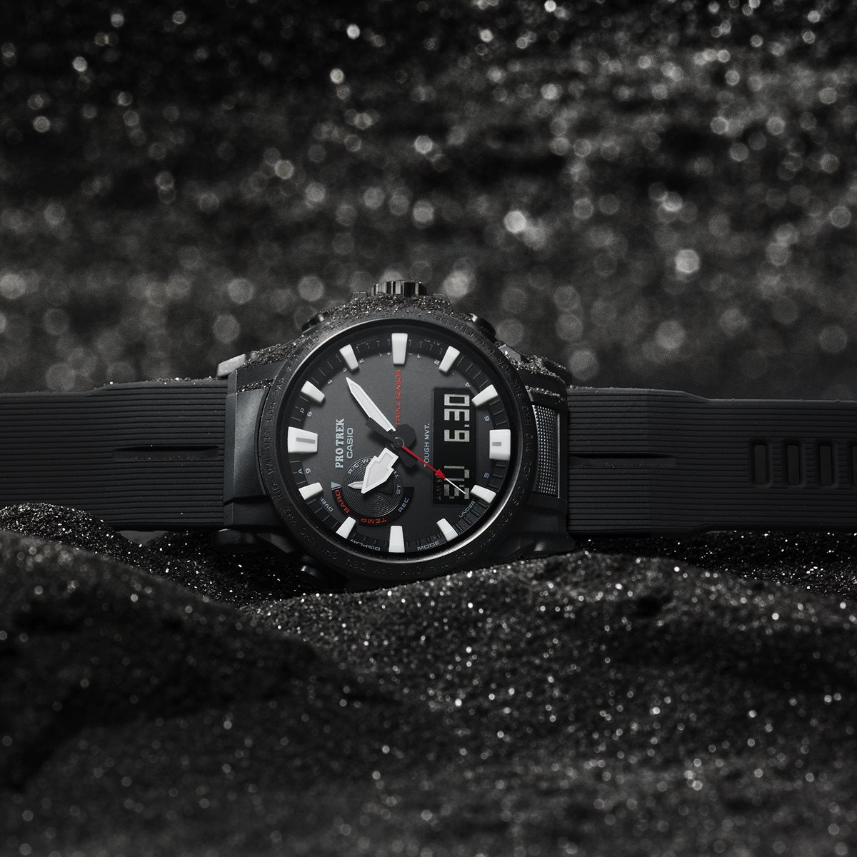 自然を愛する人の本格アウトドアギア「PRO TREK」から、環境に優しいエコ素材を外装に展開した、「クライマーライン」PRW-61のご紹介です。腕なじみの良い装着性と高い視認性はそのままに、地球に優しいバイオマスプラスチックをカシオウオッチとして初採用。ケースとウレタンバンド、樹脂製の裏蓋に使用しています。バイオマスプラスチックとは、原料として再生可能な有機資源由来の物質を含み、化学的または生物学的に合成することにより得られる高分子材料で、循環型社会の実現に向け環境負荷低減が期待されている素材です。今回はケースと裏蓋にはヒマシ油、バンドにはトウモロコシを原料としたバイオマスプラスチックを採用しました。ソフトウレタンバンドにはターゲットガイドを採用し、秒針の示す方角の判読性を高め、より方位が分かりやすい機能美あるデザインで表現しています。また、文字板には、針を太くした見やすいバーインデックスを採用し、視認性を高めています。PRW-61Yには、ベゼルにIPを施したデザインとしています。時計本来の機能として世界6局の電波を受信するマルチバンド6やタフソーラーなど実用的な機能も兼ね備えます。様々なシーンで対応する高い機能性と実用性をジャストサイズに詰め込んだモデルです。