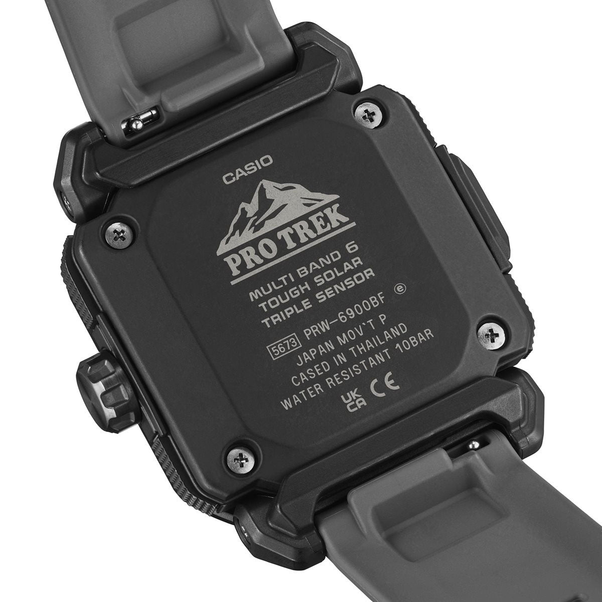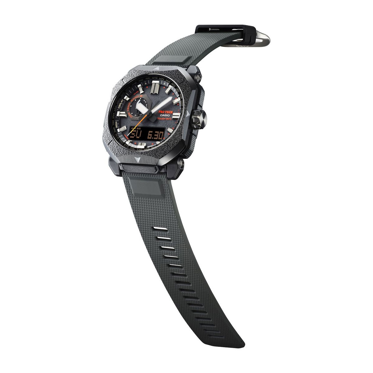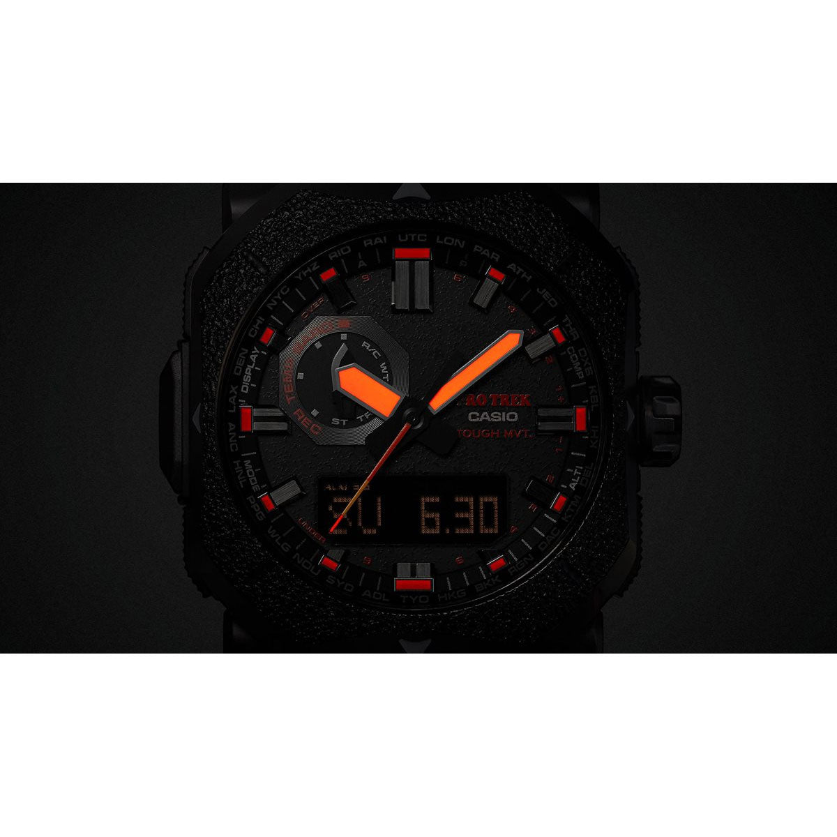 自然を愛する人の本格アウトドアギアPRO TREKクライマーラインから、環境に配慮されたエコ素材を採用し、荒々しいアウトドアスタイルをテーマに仕上げたPRW-6900BFのご紹介です。PRW-6900BFは、キャンプなどのアウトドアシーンで人気の焚火から着想を得たデザインを展開。赤く燃え上がる焚火の炎をイメージした暗所で赤く発光する蓄光を、時分針と秒針の先端部、文字板のインデックスにレイアウトしました。また、メタルベゼルの表面には、火にくべるダッチオーブンなどの鋳物を想起させる荒々しいテクスチャーを凹凸感ある鍛造処理で表現。ケースおよびバンドと樹脂製の裏蓋には環境負荷の低減が期待されるバイオマスプラスチック樹脂を採用、環境への配慮を形にしました。トリプルセンサーが搭載されているので、方位、高度/気圧、温度を計測できます。計測機能に加え、時計本来の機能として世界6局の電波を受信するマルチバンド6やタフソーラーなど実用的な機能も兼ね備えます。ブッシュクラフトなどのシーンにもマッチするアウトドアギアらしい力強いデザインに、様々なシーンで対応する高い機能性と実用性を詰め込んだモデルです。