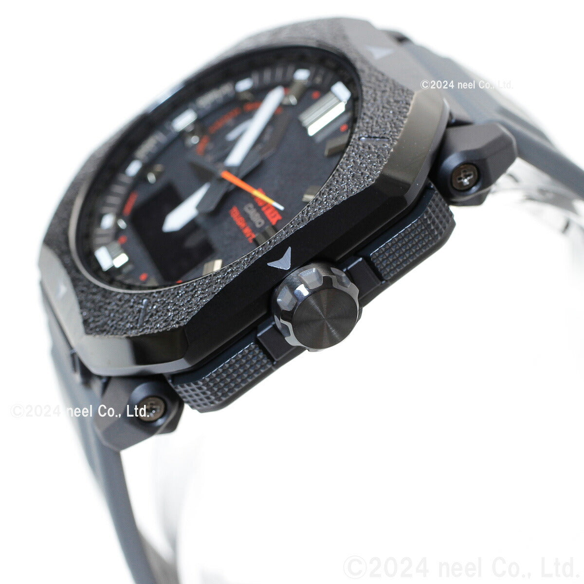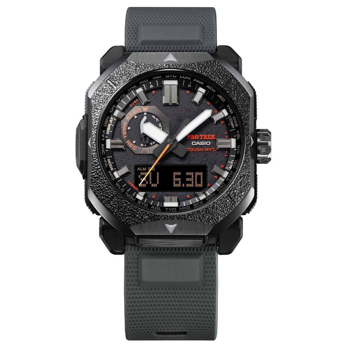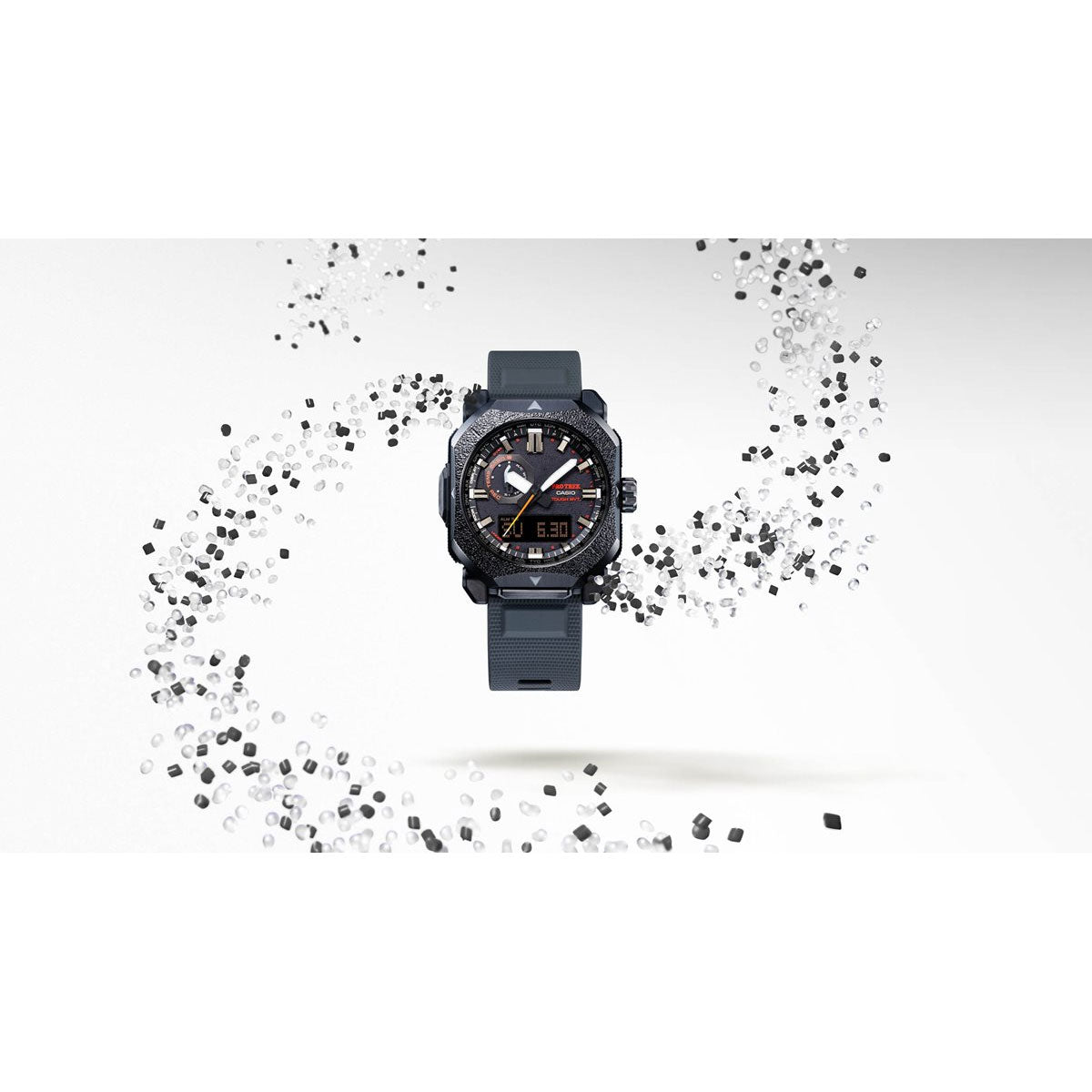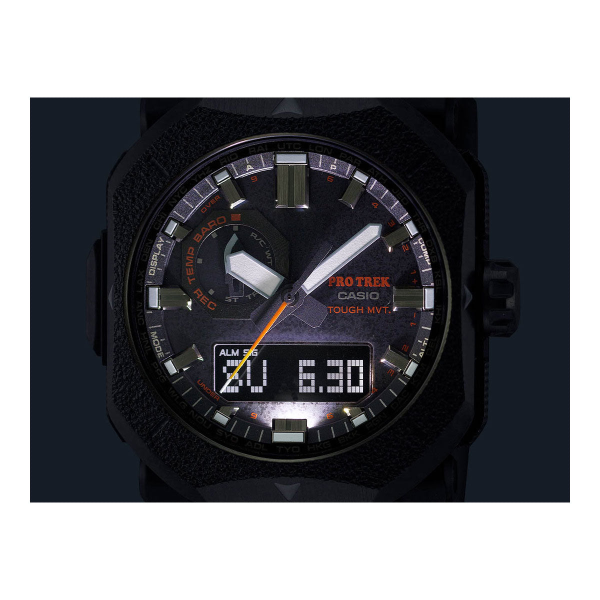 自然を愛する人の本格アウトドアギアPRO TREKクライマーラインから、環境に配慮されたエコ素材を採用し、荒々しいアウトドアスタイルをテーマに仕上げたPRW-6900BFのご紹介です。PRW-6900BFは、キャンプなどのアウトドアシーンで人気の焚火から着想を得たデザインを展開。赤く燃え上がる焚火の炎をイメージした暗所で赤く発光する蓄光を、時分針と秒針の先端部、文字板のインデックスにレイアウトしました。また、メタルベゼルの表面には、火にくべるダッチオーブンなどの鋳物を想起させる荒々しいテクスチャーを凹凸感ある鍛造処理で表現。ケースおよびバンドと樹脂製の裏蓋には環境負荷の低減が期待されるバイオマスプラスチック樹脂を採用、環境への配慮を形にしました。トリプルセンサーが搭載されているので、方位、高度/気圧、温度を計測できます。計測機能に加え、時計本来の機能として世界6局の電波を受信するマルチバンド6やタフソーラーなど実用的な機能も兼ね備えます。ブッシュクラフトなどのシーンにもマッチするアウトドアギアらしい力強いデザインに、様々なシーンで対応する高い機能性と実用性を詰め込んだモデルです。