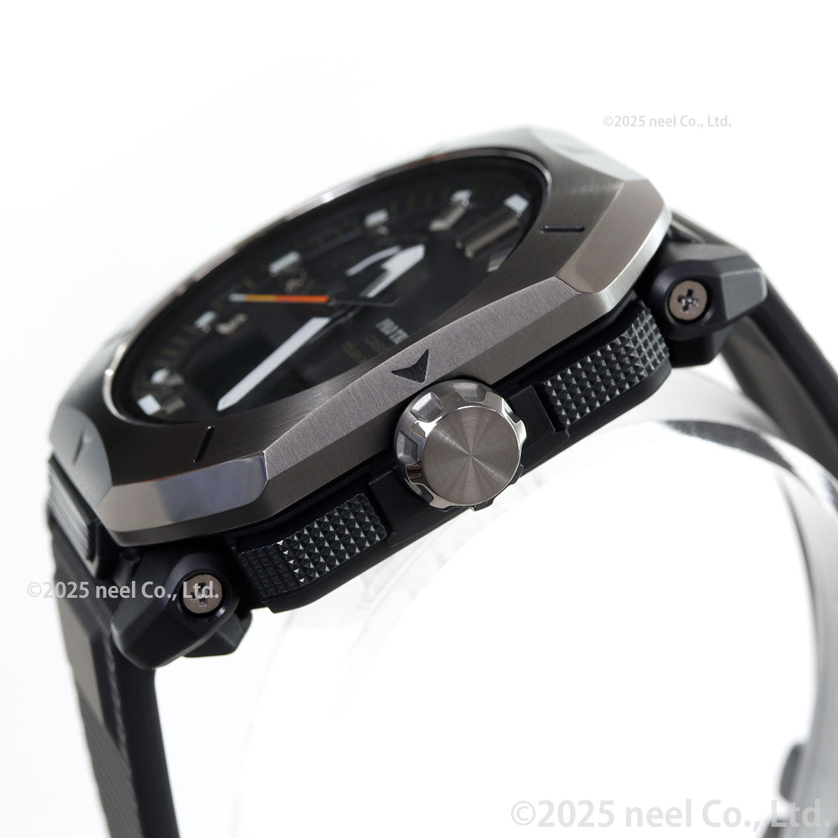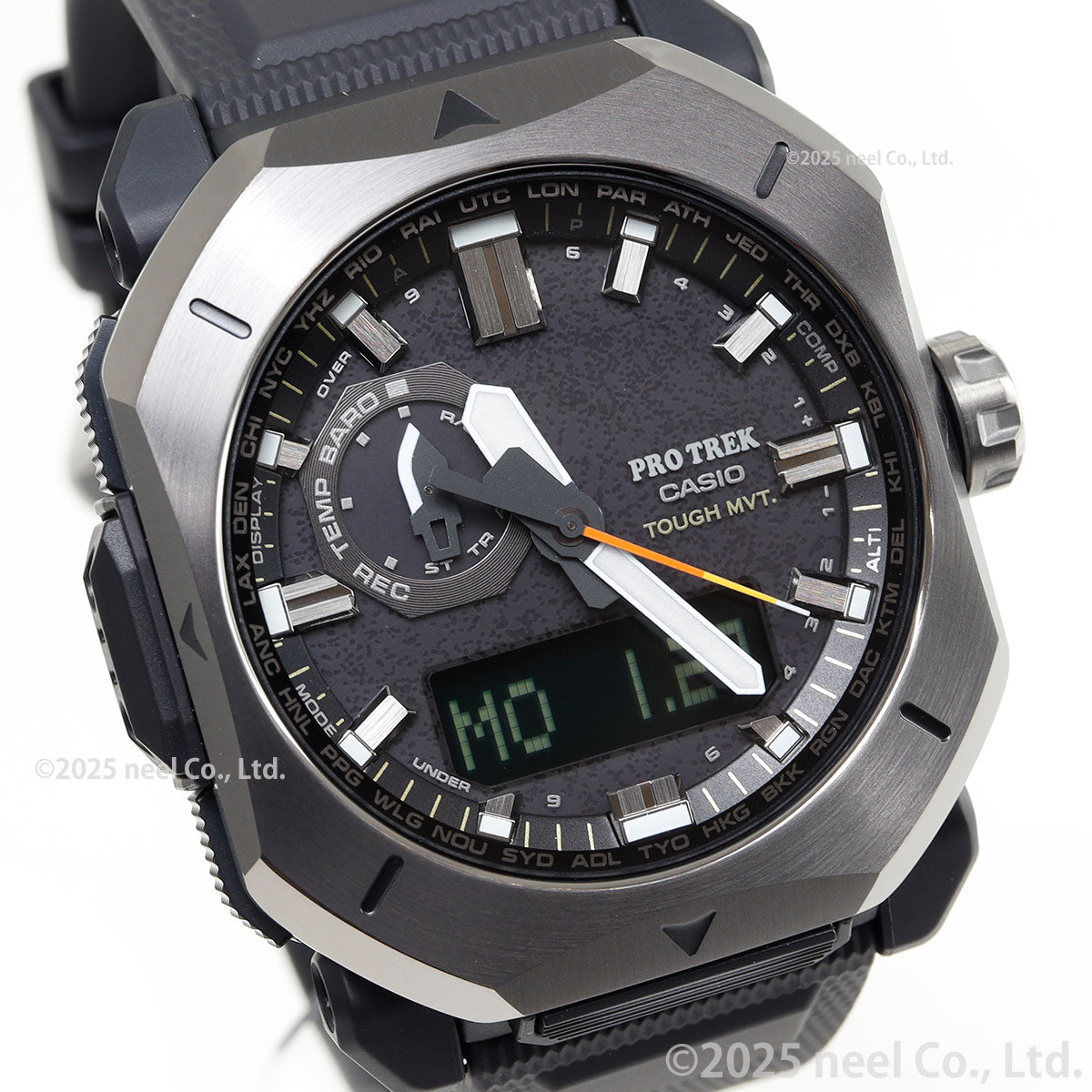 自然を愛する人の本格アウトドアギアPRO TREKから、環境に配慮されたエコ素材を採用した、電波ソーラー搭載のPRW-6900Yのご紹介です。PRW-6900では、荒々しいアウトドアスタイルをデザインテーマに定め、武骨な薪割りの斧をイメージした、側面を削ぎ落としたシャープな形状のメタルベゼルを採用しています。またベゼルだけでなく、10時位置にあるインダイアルの針も、アウトドアツールのナイフをイメージした鋭角的なデザイン形状にしています。秒針には揺れる炎をイメージさせるオレンジグラデーションを配色。文字板には、ダッチオーブンのような鋳物の表面を想起させる凹凸感あるデザインが入っています。PRW-6900Yのバンドは、環境に配慮したバイオマスプラスチック素材のソフトウレタンバンドとなっています。ケースと樹脂製の裏蓋にもバイオマスプラスチックの素材を使用しています。時計本来の機能として世界6局の電波を受信するマルチバンド6やタフソーラーなど実用的な機能も兼ね備えます。様々なシーンで対応する高い機能性と実用性を詰め込んだモデルです。