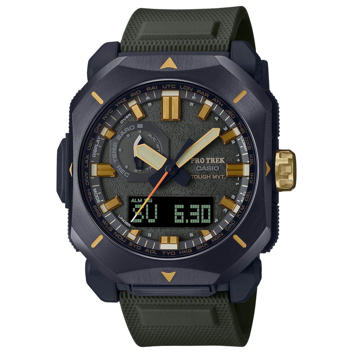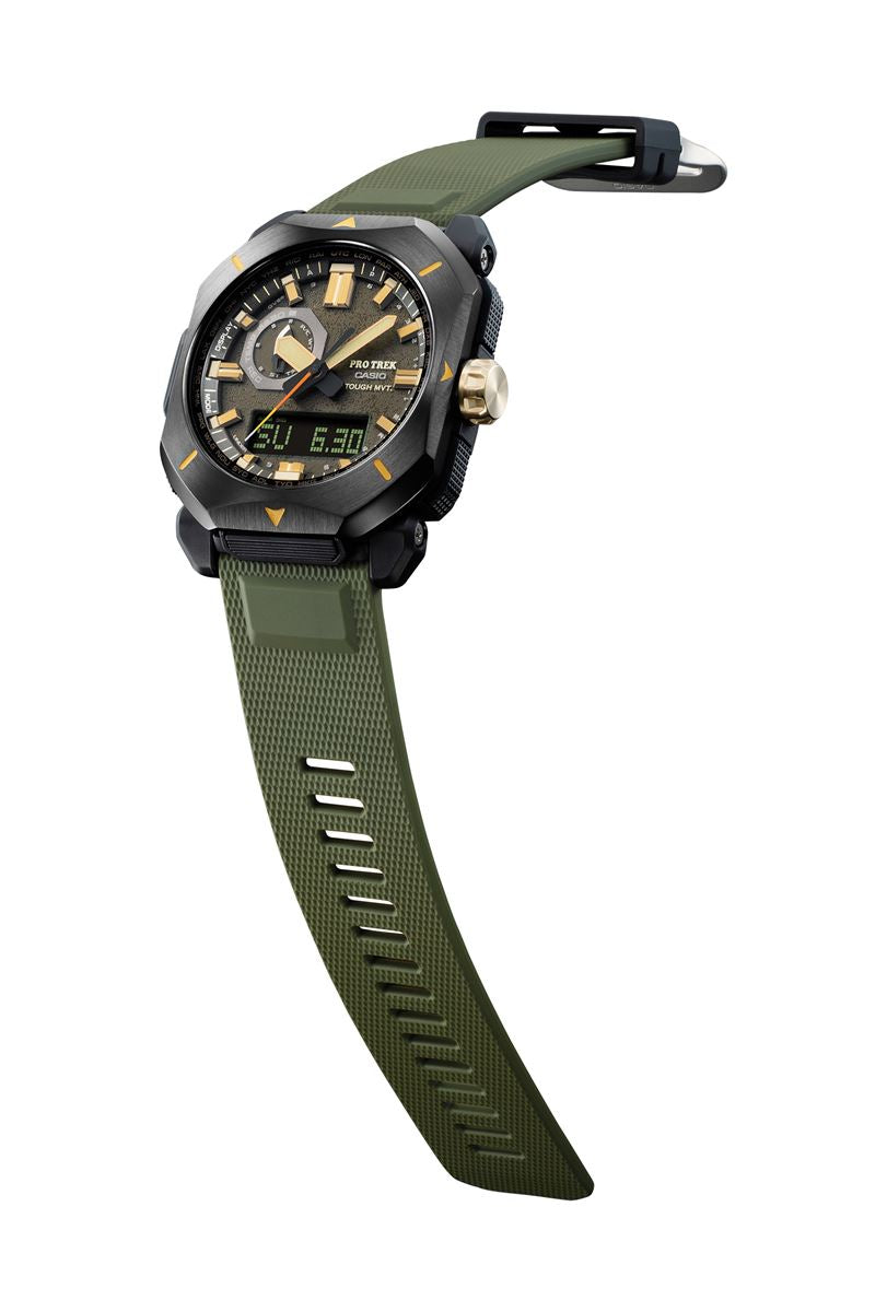 自然を愛する人の本格アウトドアギアPRO TREKから、環境に配慮されたエコ素材を採用した、電波ソーラー搭載のPRW-6900Yのご紹介です。PRW-6900では、荒々しいアウトドアスタイルをデザインテーマに定め、武骨な薪割りの斧をイメージした、側面を削ぎ落としたシャープな形状のメタルベゼルを採用しています。またベゼルだけでなく、10時位置にあるインダイアルの針も、アウトドアツールのナイフをイメージした鋭角的なデザイン形状にしています。秒針には揺れる炎をイメージさせるオレンジグラデーションを配色。文字板には、ダッチオーブンのような鋳物の表面を想起させる凹凸感あるデザインが入っています。PRW-6900Yのバンドは、環境に配慮したバイオマスプラスチック素材のソフトウレタンバンドとなっています。ケースと樹脂製の裏蓋にもバイオマスプラスチックの素材を使用しています。時計本来の機能として世界6局の電波を受信するマルチバンド6やタフソーラーなど実用的な機能も兼ね備えます。様々なシーンで対応する高い機能性と実用性を詰め込んだモデルです。