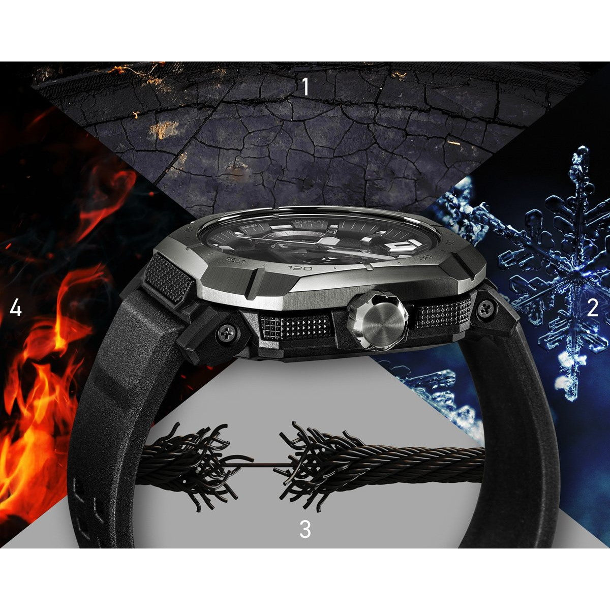 大自然を舞台に活躍する本格アウトドアウオッチ、PRO TREK PRW-B1000。アウトドアの聖地「ヨセミテ」のエル・キャピタンをイメージした角型ステンレススチールベゼルと、かつてのロッククライマーが使用したピトンをモチーフにした9時位置の小針が、自然への敬意と冒険心を表現しています。タフソーラーシステムは蛍光灯などの弱い光でも発電し、電波受信やライトなどの機能を安定駆動。長時間のトレッキングやキャンプでも電池切れの心配なく、安心してご使用いただけます。世界6局(日本2局、中国、北米、イギリス、ドイツ)の標準電波を受信するマルチバンド6とBluetooth(R)接続による2wayの時刻自動補正機能は、PRO TREKシリーズで唯一の特長。常に正確な時刻でアウトドア活動をサポートします。トリプルセンサー(方位・気圧・温度)搭載により、方位、気圧、高度、温度を正確に計測。大型ボタン設計でグローブ着用時も確実に操作できます。Bluetooth(R)でスマートフォンと連携すれば、高度の自動補正やロケーションインジケーターで目的地の方角を確認可能。ルートログ機能で行動記録も残せます。アラームやタイマー設定もアプリで簡単操作。高輝度なフルオートダブルLEDライトにより、腕を傾けるだけでアナログダイアルとデジタル表示が点灯。暗闇でも片手がふさがっていても時刻確認が可能です。ケースには難燃グレードのバイオマスプラスチックを採用し、バンドには軽量・高強度のセルロースナノファイバー(CNF)を使用。環境に配慮したリサイクル可能な素材で、自然を愛する方の価値観に応えます。10気圧防水機能も備え、PRO TREK PRW-B1000はキャンプから本格登山まであらゆるアウトドアシーンで頼りになる高い機能性と実用性を詰め込んだモデルです。