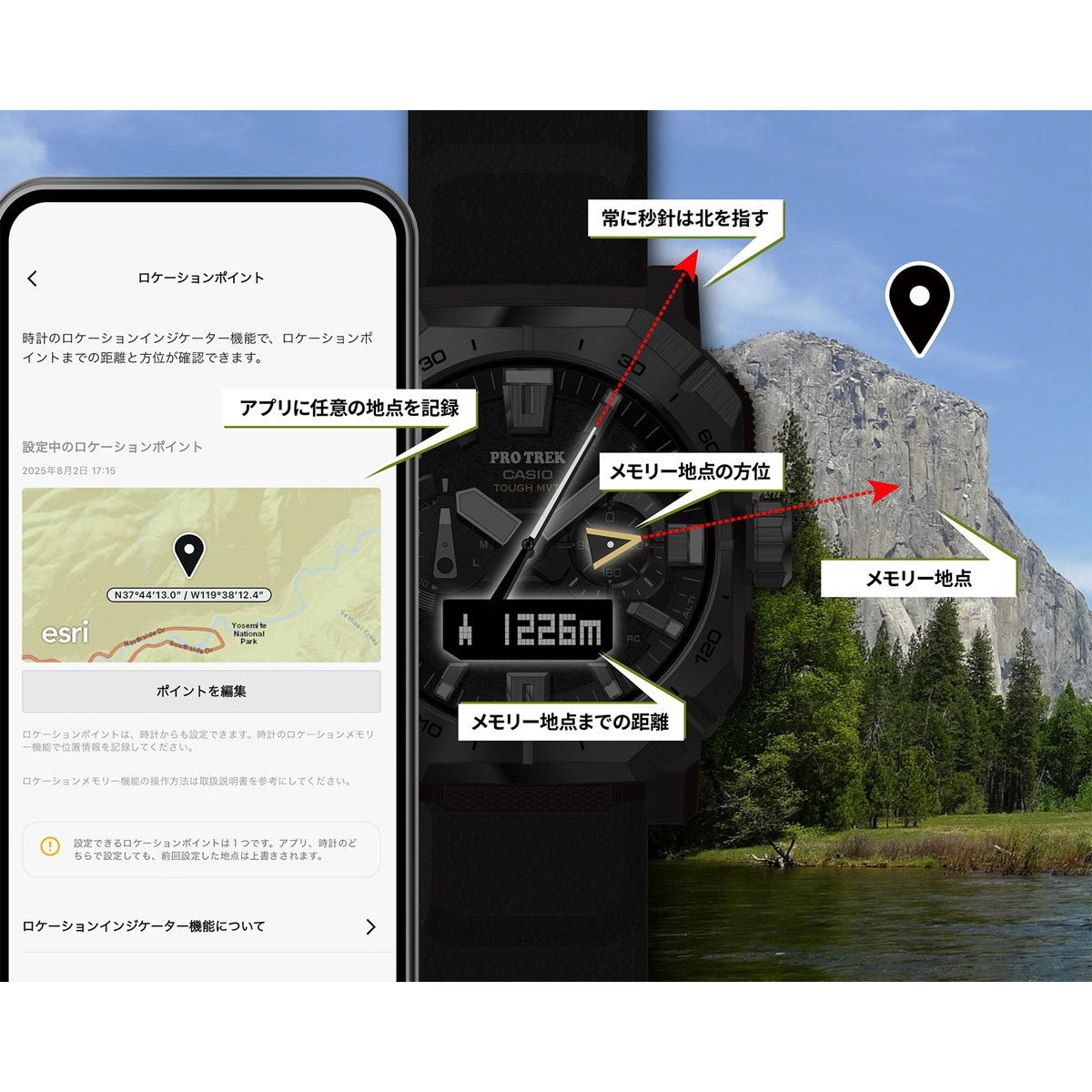 大自然を舞台に活躍する本格アウトドアウオッチ、PRO TREK PRW-B1000に、ヨセミテの青みがかった情景から着想を得た新色が加わりました。ヨセミテの岩壁をイメージした特徴的な角型ステンレススチールベゼルを淡いブルーで彩り、サブダイアルパーツにも同色のアクセントをプラス。澄んだ空気と花崗岩が見せる静謐な青を、上質かつアクティブに表現しています。デザインは、自然への敬意と冒険心を象徴。9時位置の小針は、かつてのロッククライマーが用いたピトンをモチーフにし、本格志向のディテールを際立たせます。タフソーラーは蛍光灯などの弱い光でも発電し、電波受信やライトなどの機能を安定駆動。長時間のトレッキングやキャンプでも電池切れの不安を軽減します。時刻は、世界6局(日本2局、中国、北米、イギリス、ドイツ)の標準電波を受信するマルチバンド6と、Bluetooth(R)接続の2Way自動補正に対応。PRO TREKシリーズで唯一の組み合わせにより、常に正確な時刻で行動をサポートします。トリプルセンサー(方位・気圧・温度)搭載で、方位・気圧・高度・温度を的確に計測。大型ボタン設計により、グローブ着用時でも確実に操作できます。スマートフォンと連携すれば、高度の自動補正や目的地の方角と距離を表示するロケーションインジケーター、行動を記録できるルートログなどの機能が使用可能。アラームやタイマー設定もアプリから直感的に行えます。さらに、高輝度なフルオートダブルLEDライトを搭載し、腕を傾けるだけでアナログダイアルとデジタル表示の両方が点灯。暗所や両手がふさがる場面でも視認性を確保します。素材にも配慮し、ケースには難燃グレードのバイオマスプラスチック、バンドにはCORDURA re/cor(TM)を採用。環境に配慮した素材で、自然を愛する価値観に応えます。10気圧防水と合わせ、キャンプから本格登山まで、頼れる機能性と実用性を凝縮した一本です。淡いブルーがもたらす静けさと力強さ。その腕元に、ヨセミテの息吹を。PRO TREK PRW-B1000の新色、登場。