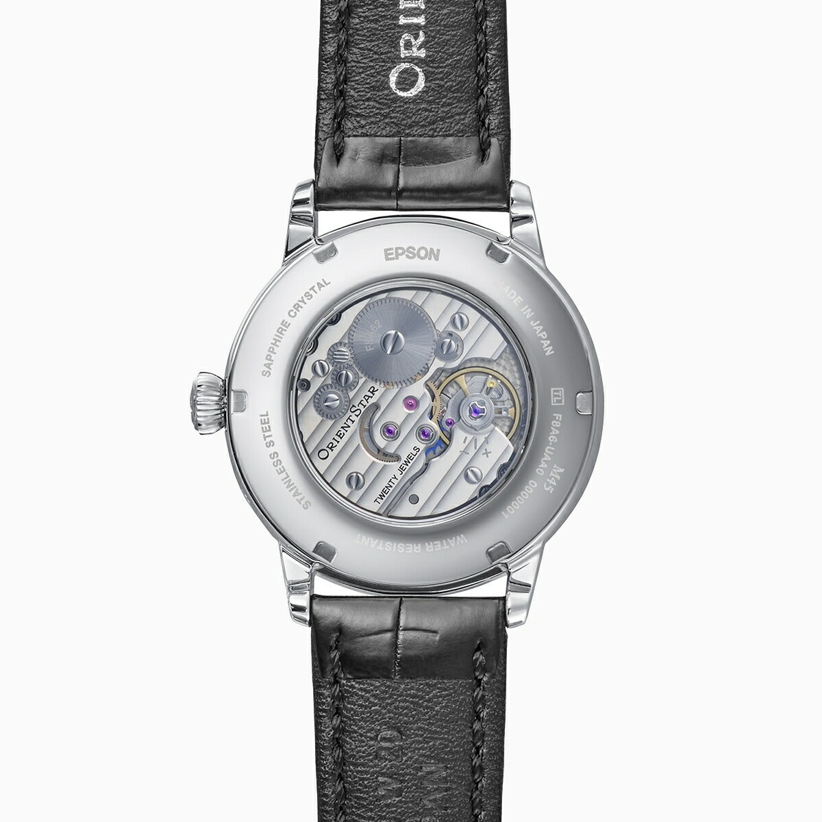 オリエントスターMコレクションズから、『M45 F8メカニカルムーンフェイズ ハンドワインディング』が登場。「夜の静寂に月がひとつ」をコンセプトに、ムーンフェイズ機構を搭載しながらも文字板の要素を極限まで削ぎ落したシンプルかつ美しいデザインが特徴です。クラシカルな2針、月齢機構、手巻きのムーブメントなど、現代のせわしない時の流れから解放されるような、ゆったりとした時間を楽しむ工夫が随所に施されています。Made in Japan。