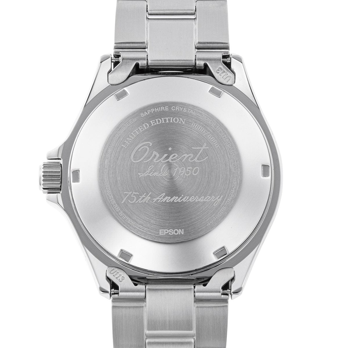 ダイバーズウオッチの意匠を持つモデルは、オリエントの歴史において1960年代から長年に渡る系譜を築いてきた代表作です。『オリエントマコ』の愛称で親しまれてきた本シリーズは、2004年の登場から文字板のカラーやディテールに多彩なバリエーションを展開し、世界の時計愛好家たちの間で広く親しまれてきました。数量限定モデルのテーマは「青空と風を切るような爽快感」。アクティブなシーンに映えるスカイブルーの文字板、風を思わせる放射の型打ち模様、太陽光をイメージした秒針、そして1950年代に用いられていた筆記体の旧オリエントロゴなどの共通仕様が特別感を強調しています。また、スクリューバックとねじ込み式りゅうずにより20気圧の防水を確保したケースのうら蓋にも、筆記体による「Orient Since 1950 75th Anniversary」の文字と数量限定シリアル番号の刻印が記されています。