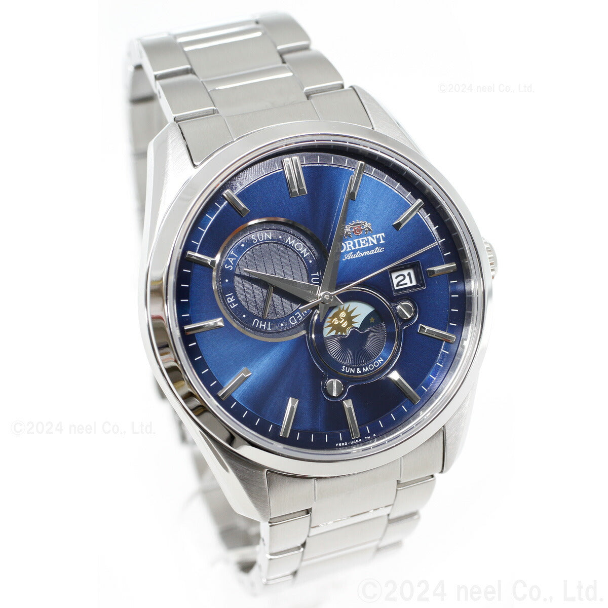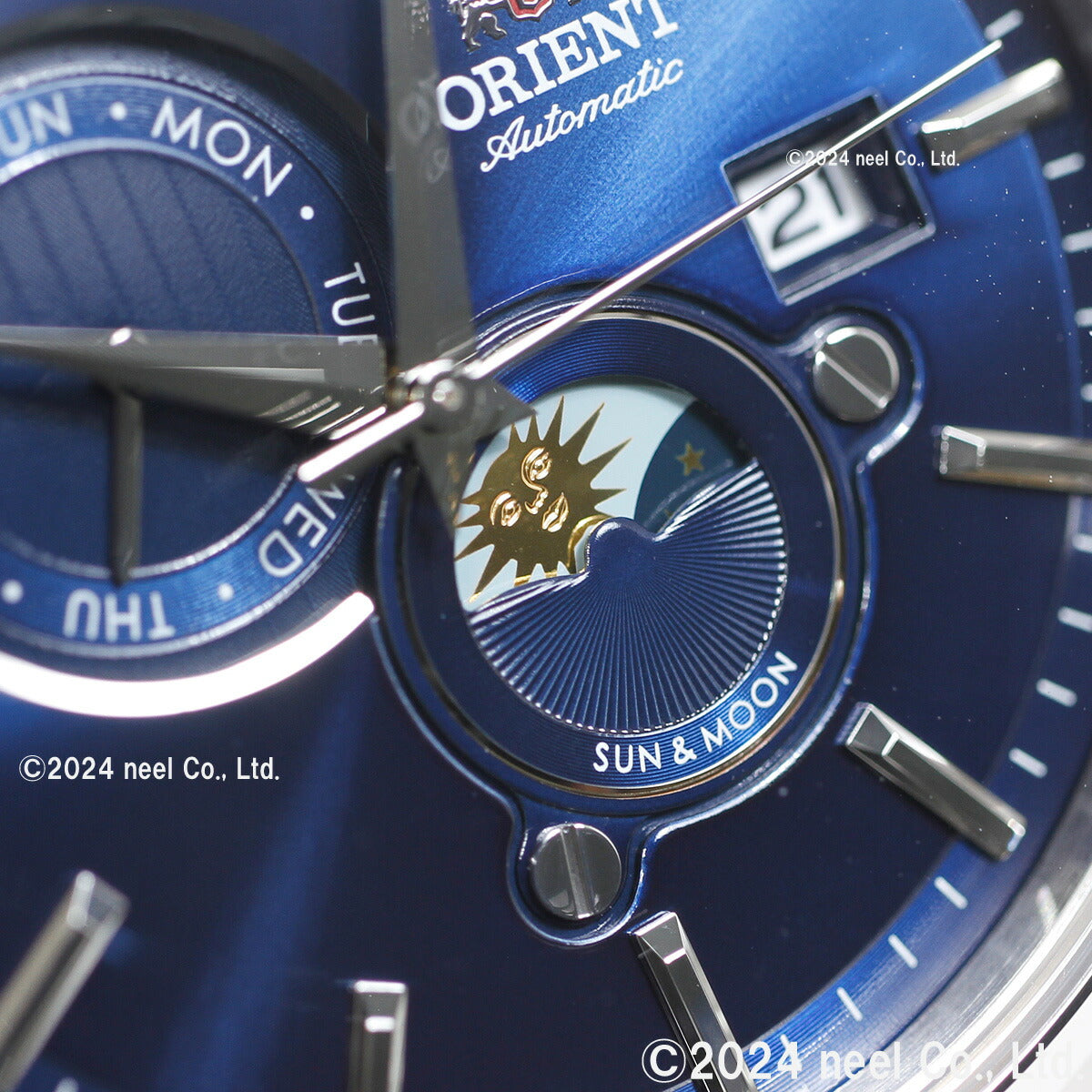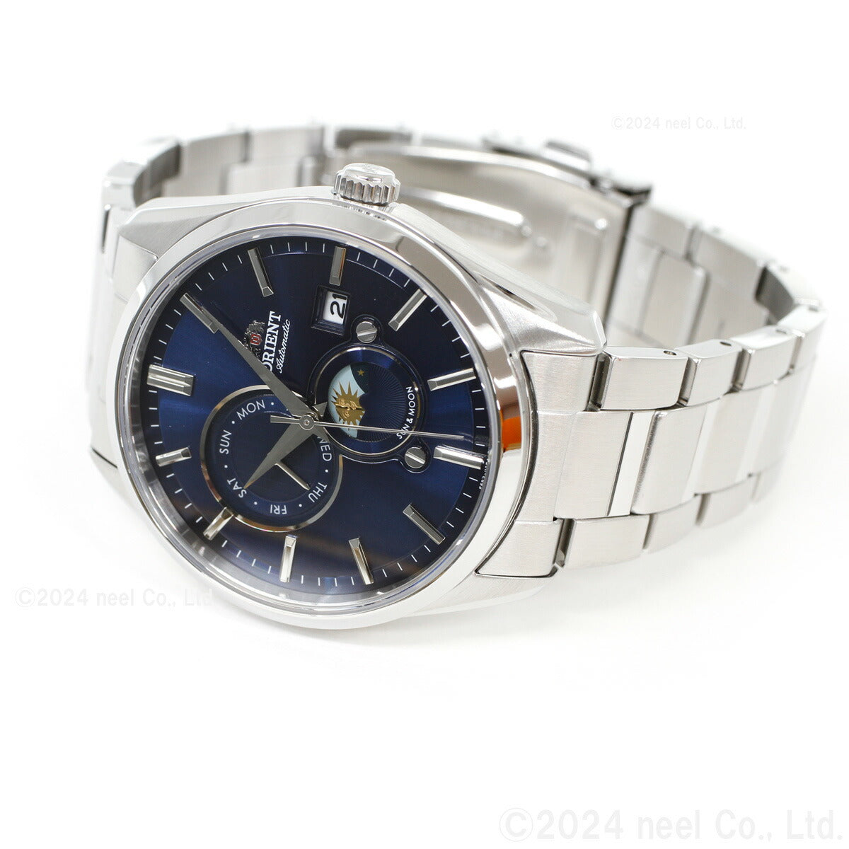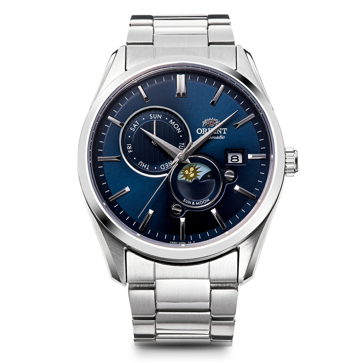 オリエントの顔である「Sun&Moon」のコンテンポラリーコレクションが新キャリバー&新デザインで登場。24時間を特徴的な太陽と月の図柄で表現。挨拶のように現れる太陽と月が日々に彩をを添えます。風防にはサファイアクリスタルを採用し、レイヤー構造で奥行きのある文字板が高級感を演出。ラグからケース側面に至る塊感あるケース形状はビジネスをはじめとしたあらゆる利用シーンで違和感なく着用できます。