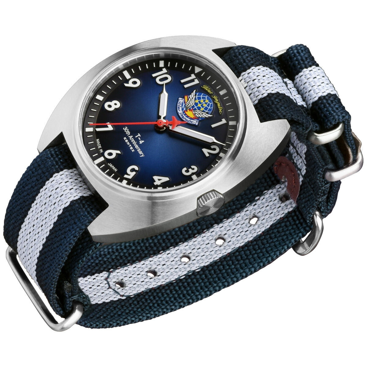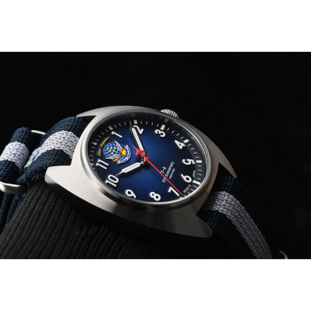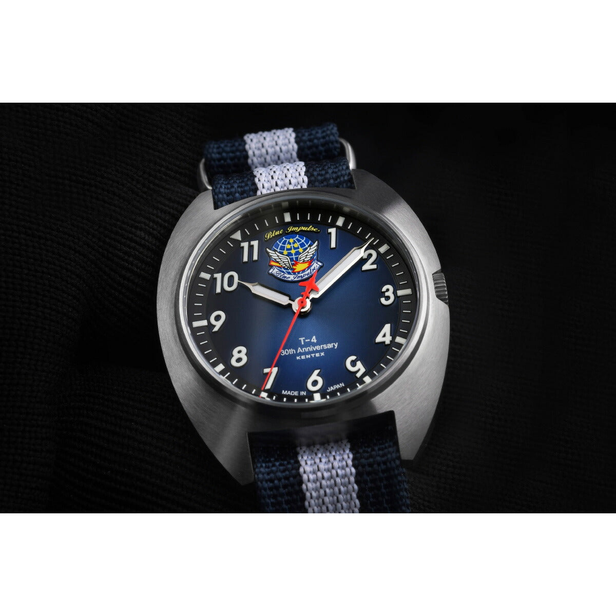 「高品質な時計を、適正な価格で。」をコンセプトとして企画、製造している日本の腕時計ブランド。ケンテックスは創業以来、時計外装の技術とデザイン力を培ってきました。私たちは日本のクラフツマンシップでディテールにこだわり抜き、機能と美を融合させた価値ある時計を造ります。ブルーインパルスモデルから、2025年にブルーインパルスの運用機として運用30周年を迎える「T-4」を記念して企画されたアニバーサリーモデルが登場。現役のT-4ブルーインパルスの功績を称えるに相応しい、その世界観が随所に鏤められたファン垂涎のデザインとなっている。時計本体も、記念時計でありながら、ミリタリーウォッチに必須な高い視認性と100M防水性を誇る。また、リューズが手首にあたらないようケースに一体化した設計や、NATOベルト穴回りのほつれを防ぐ革の補強加工など、本格ミリタリーウォッチのスペック。腕回りは140~220mmで、メンズからボーイズの幅広いサイズに対応。300本限定生産。