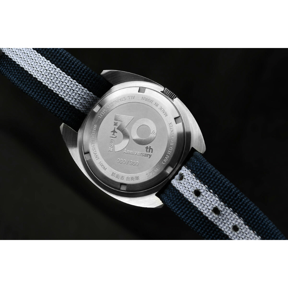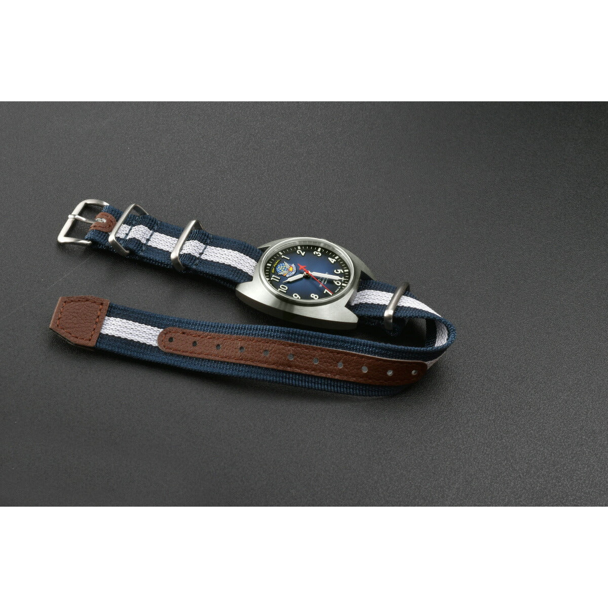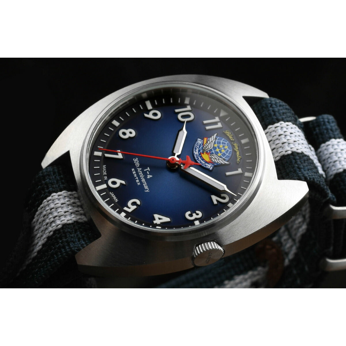 「高品質な時計を、適正な価格で。」をコンセプトとして企画、製造している日本の腕時計ブランド。ケンテックスは創業以来、時計外装の技術とデザイン力を培ってきました。私たちは日本のクラフツマンシップでディテールにこだわり抜き、機能と美を融合させた価値ある時計を造ります。ブルーインパルスモデルから、2025年にブルーインパルスの運用機として運用30周年を迎える「T-4」を記念して企画されたアニバーサリーモデルが登場。現役のT-4ブルーインパルスの功績を称えるに相応しい、その世界観が随所に鏤められたファン垂涎のデザインとなっている。時計本体も、記念時計でありながら、ミリタリーウォッチに必須な高い視認性と100M防水性を誇る。また、リューズが手首にあたらないようケースに一体化した設計や、NATOベルト穴回りのほつれを防ぐ革の補強加工など、本格ミリタリーウォッチのスペック。腕回りは140~220mmで、メンズからボーイズの幅広いサイズに対応。300本限定生産。