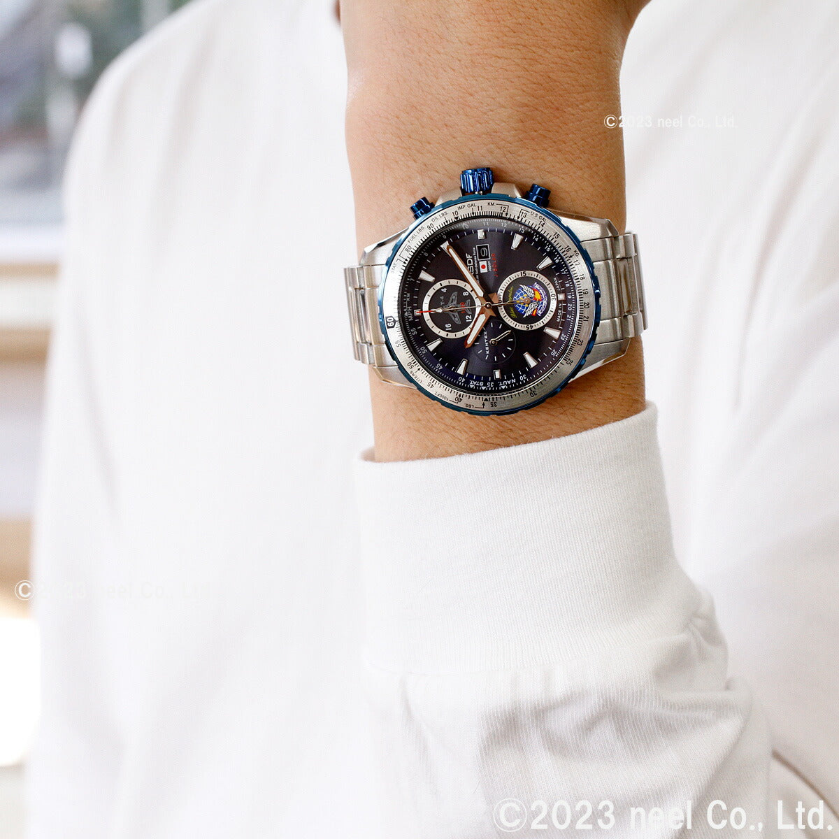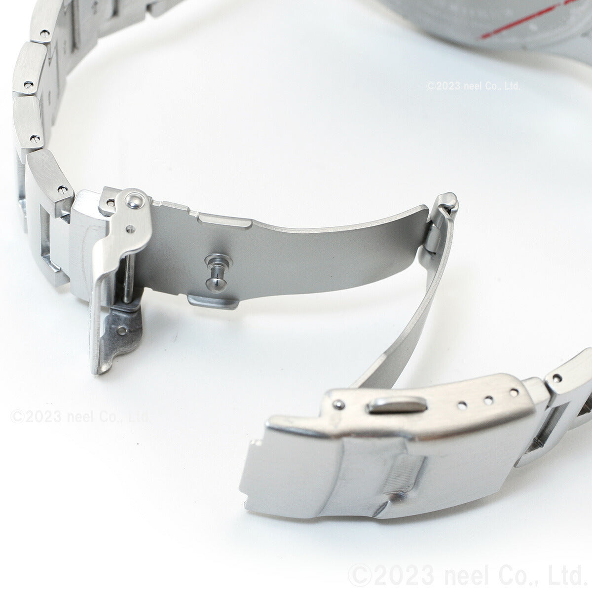 | ■10気圧防水 ■クロノグラフ(センター針:1秒、12時:1/20秒、6時:60分積算計) ■稼働時間:6ヵ月(フル充電時) ■充電時間:5時間(参考環境100Klx 太陽光下)、47時間(参考環境3000lx 蛍光灯下)※太陽光平均32Klx~100Klx(1Klx=1000lx) ■パワー消耗警告機能 ■クイックスタート機能 ■両方向回転ベゼル ■フライトコンピューター(回転計算尺)機能 ■強畜光インデックス(ホワイト) ◇1960本限定生産(裏蓋にシリアル刻印) |