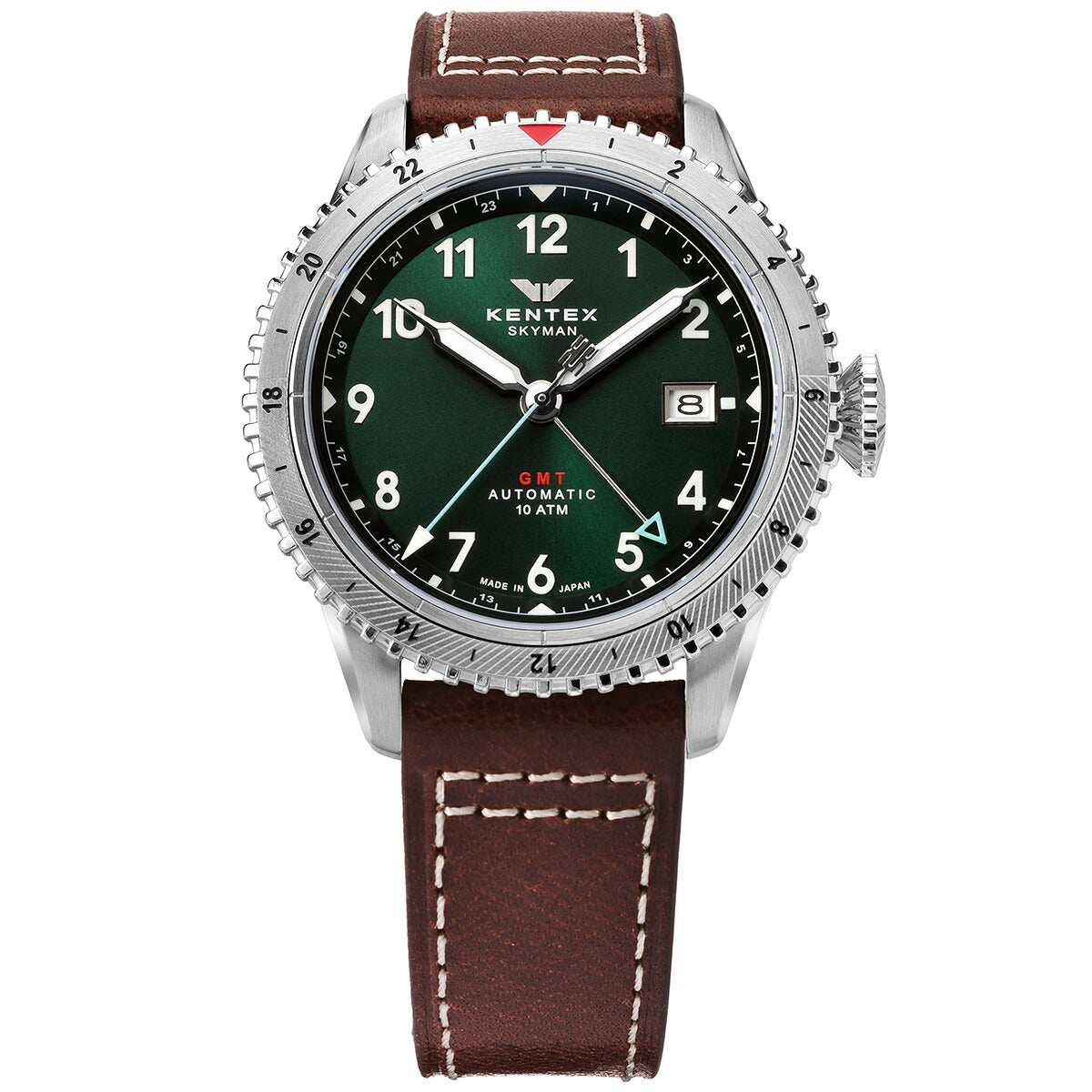 「高品質な時計を、適正な価格で。」をコンセプトとして企画、製造している日本の腕時計ブランド。ケンテックスは創業以来、時計外装の技術とデザイン力を培ってきました。私たちは日本のクラフツマンシップでディテールにこだわり抜き、機能と美を融合させた価値ある時計を造ります。パイロットウォッチ「SKYMAN」シリーズに、新たなGMTモデルが登場。直径41.0mmのケースに、最大3つのタイムゾーンを同時表示できる両方向回転式GMTベゼルを搭載。視認性に優れたオールアラビアインデックスや、グローブ越しでも確実に操作できるビッグクラウンなど、パイロットウォッチの血統を受け継ぐ機能美を随所に備えています。風防には無反射コーティングを施したサファイアクリスタルを採用。日本製ムーブメントは自社で0~+25秒まで精密に調整し、確かな精度を実現しています。■仕様の詳細■[1]ムーブメントは日本製 NH34 自動巻きGMT(21600振動、24石、秒針規制機能、デイト)を採用。精度を自社にて日差0~+25秒に調整。[2]ケースは医療用にも使われる高耐蝕SUS316Lステンレス製。直径41.0mmのケースに、直径42.5mmのベゼルを組み合わせることで、操作性を向上。GMTベゼルの6~18時位置にはスラッシュパターンを刻むことで、夜間帯であることをひと目で判別できるデザインとしている。[3]ベゼルは両方向回転式、24ピッチで、最大3つのタイムゾーンを同時表示可能な本格GMT仕様。[4]風防には、片面無反射コーティングのサファイアクリスタルを採用し、優れた耐傷性と高い透明度を長期間維持。[5]パイロットウォッチでありながら、日常からアウトドアまで安心して使える100M防水仕様。[6]リューズには、グローブを着用したままでも操作が可能なビッグクラウンを採用。往年のパイロットウォッチを彷彿とさせるクラシックなデザインで、実用性も兼ね備えている。[7]文字盤は、パイロットウォッチの血統を受け継ぐ高視認性のアラビア数字デザイン。植字のインデックスには強蓄光を施し、暗所でも優れた視認性を発揮。[8]針は視認性に優れたストレート型を採用。GMT針はアロー型とすることで、時針との識別性を高め、瞬時の時刻読み取りを可能にしている。[9]裏蓋には、プロペラ機のレシプロエンジンをモチーフとしたデザインが、型押し加工により立体的かつ繊細に表現されている。[10]レザーストラップは、使い込むほどに腕に馴染み、深みのある風合いへと変化するオイリーレザーを使用。ベルト裏面にはラバーコーティングレザーを使し、汗による不快感や劣化を抑えることで、快適な装着感が持続します。バックルは、穴を傷めないDバックルを採用。