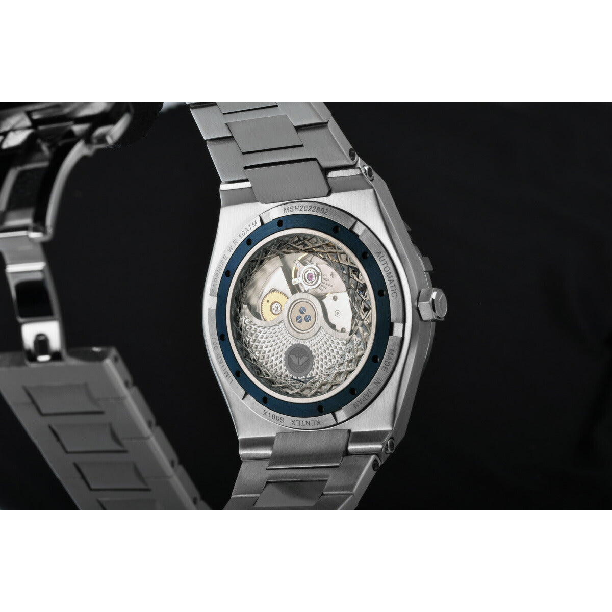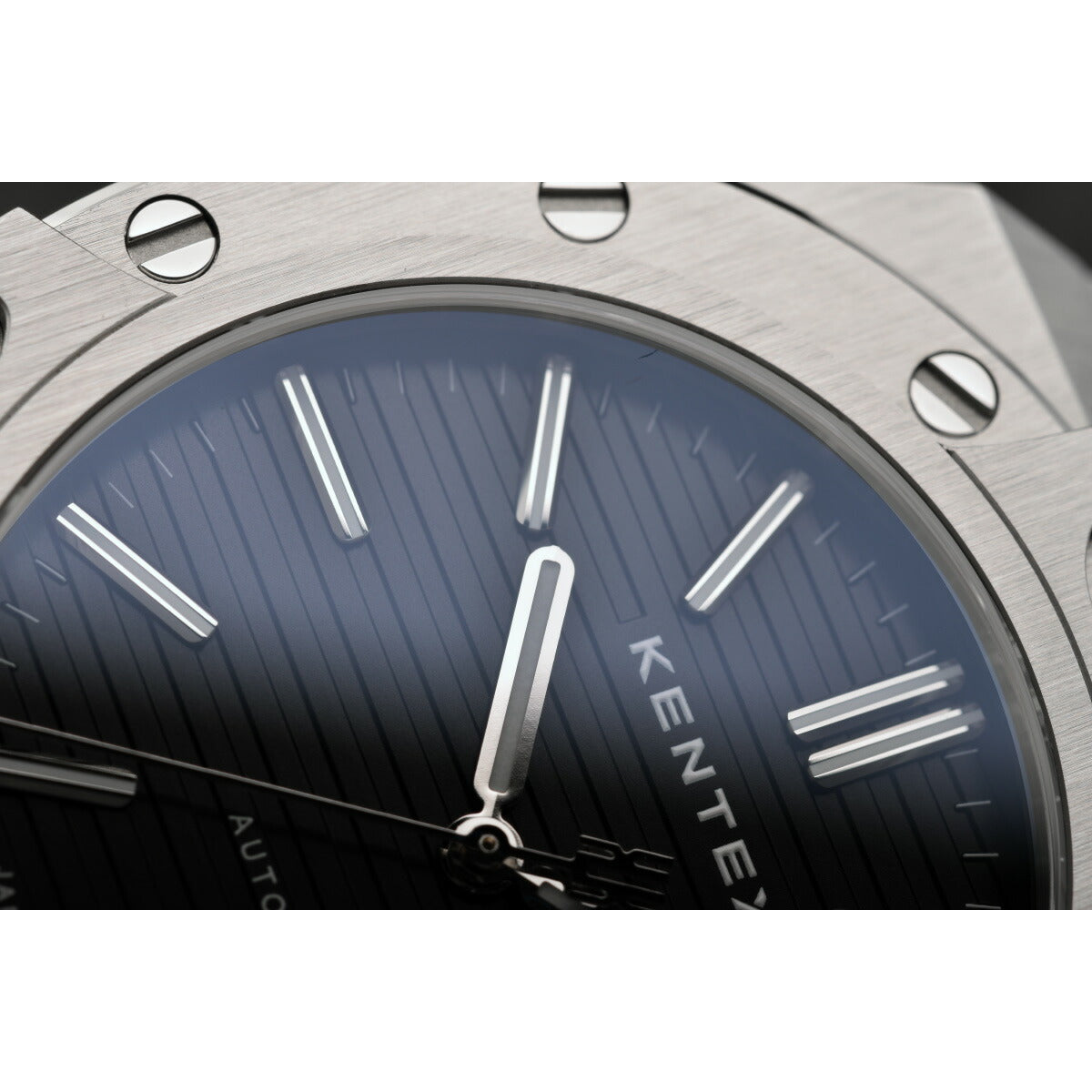 KENTEXのフラッグシップ「CRAFTSMAN(クラフツマン)」シリーズから、江戸切子を取り入れた本格機械式モデルが登場。創業以来、流行を追うのではなく、時を経ても価値が色褪せない時計作りを目指してきたKENTEXが、創業35周年を機に「時を超える日本の輝き」というテーマで取り組んだ本作。悠久の時を感じさせる海をテーマに、その向こう側にある新しい地平線を目指す、その挑戦の象徴として船の窓「舷窓」をモチーフにしたユニークなベゼルデザインに、江戸切子の美しいシースルーカットガラスが裏蓋に採用されている。CNC切削を駆使した緻密なケース加工、ザラツ研摩とダイヤモンドペーストによる丹念な研摩仕上げにより、ケース表面は歪みのない輝きを放ち、どの角度からも存在感を放つ。直径42mmの適度なケースサイズは、力強さとエレガンスさを兼ね備えつつ、11.2mmに抑えた厚みで快適な着用感も実現。