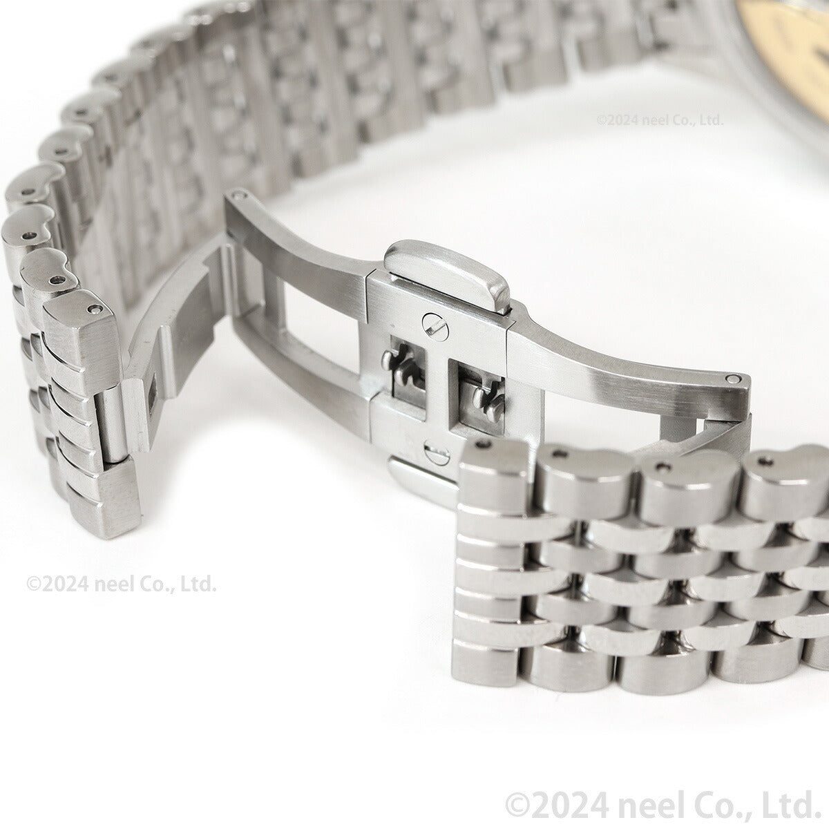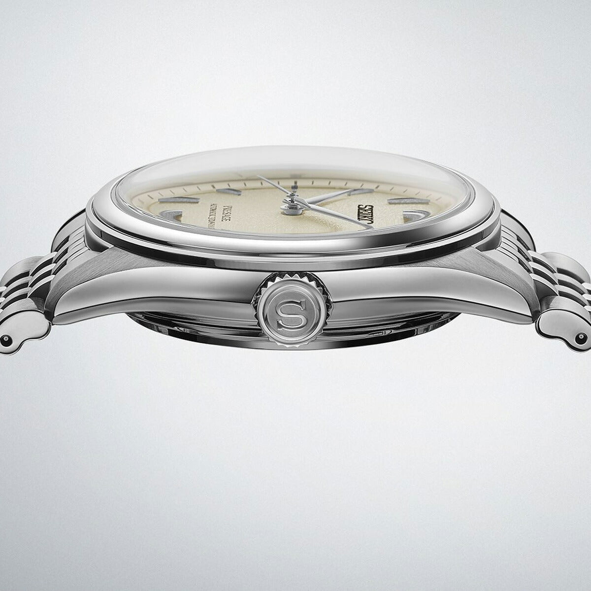 古くから日本人の暮らしを彩ってきた、機能性と美しさを併せ持った数々の工芸品に込められた感性を表現。オーセンティックな造形をベースとしながら、日本の伝統文化に根差した要素をエッセンスとして取り入れ。使い込むごとに身体や生活に馴染んでいくような飽きの来ないデザインとなっております。立体的なダイヤルが、クラシックな雰囲気を演出。日本の伝統的素材である絹に着目し、絹織物の生地をイメージした模様を採用。立体成型ダイヤルの曲面に型打ち模様を組み合わせることで、独自の深い味わいを実現しております。針やインデックスをダイヤルの曲面に合わせてカーブさせることで、ダイヤル全体が柔らかな光で輝いて見えます。ケースは柔らかな曲面で構成された、思わず指先で触れたくなるような親しみやすさを感じられる造形に。バンドには70年代のメタルバンドをイメージしたレトロ感のある繊細な多列バンドを採用。量感と高級感を備え、着用性にも配慮したデザインとなっております。