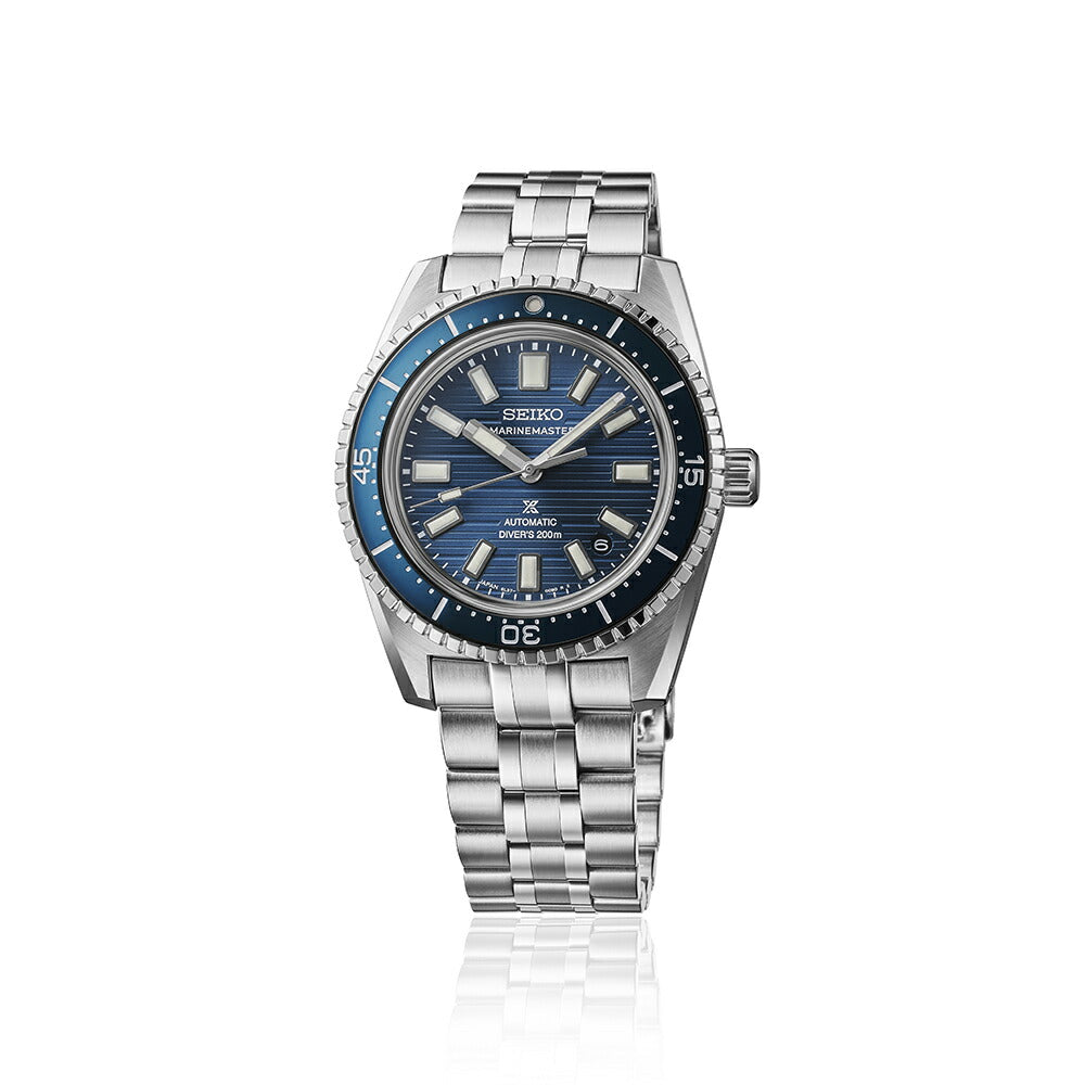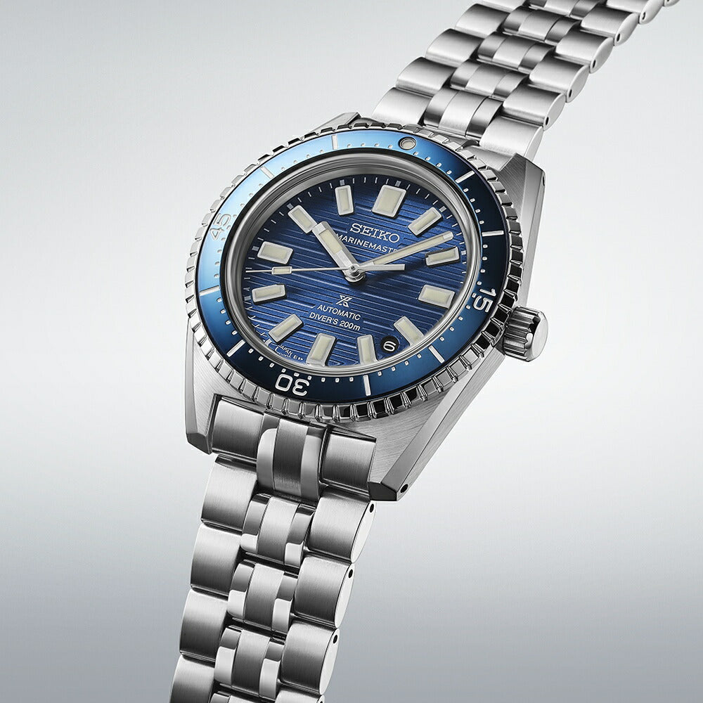 セイコーダイバーズウオッチの歴史を切り開いた、「1965 メカニカルダイバーズ」のデザインを継承。本作は、「1965 メカニカルダイバーズ」の意匠である、時・分・秒針の形状と特徴的な角型インデックスを受け継ぐとともに、ケースやブレスレットに美しいヘアライン仕上げと鏡面仕上げを施すことで、洗練された雰囲気を醸し出しています。時・分・秒針とインデックスには高輝度ルミブライトを塗布し、暗い場所でも高い視認性を確保しました。またダイヤルパターンには、太い直線と細い直線を組み合わせ、繰り返し打ち寄せる波のリズムを幾何学的模様で表現しました。レギュラーモデルは、軽やかなライトブルーのダイヤルとブルーのベゼルを組み合わせています。なお、裏ぶたを、高い防水性や耐衝撃性を伴ってシースルーバック仕様にすることは困難であり、ケースの厚みも増す要因になりますが、本作では、ダイバーズウオッチ用に開発した薄型で耐衝撃性の高い「キャリバー6L37」を搭載することで、セイコーの現行メカニカルダイバーズウオッチとして最薄の12.3mmを実現。セイコーのダイバーズウオッチで初めてシースルーバック仕様とすることで、精巧に仕上げられた機械式ムーブメントの力強い動きを眺め、楽しむことができます。