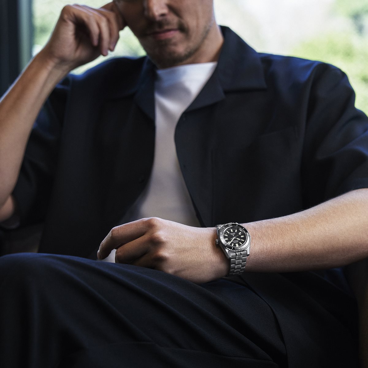 セイコーダイバーズウオッチの歴史を切り開いた、「1965 メカニカルダイバーズ」のデザインを継承。本作は、「1965 メカニカルダイバーズ」の意匠である、時・分・秒針の形状と特徴的な角型インデックスを受け継ぐとともに、ケースやブレスレットに美しいヘアライン仕上げと鏡面仕上げを施すことで、洗練された雰囲気を醸し出しています。時・分・秒針とインデックスには高輝度ルミブライトを塗布し、暗い場所でも高い視認性を確保しました。またダイヤルパターンには、太い直線と細い直線を組み合わせ、繰り返し打ち寄せる波のリズムを幾何学的模様で表現しました。レギュラーモデルは、軽やかなライトブルーのダイヤルとブルーのベゼルを組み合わせています。なお、裏ぶたを、高い防水性や耐衝撃性を伴ってシースルーバック仕様にすることは困難であり、ケースの厚みも増す要因になりますが、本作では、ダイバーズウオッチ用に開発した薄型で耐衝撃性の高い「キャリバー6L37」を搭載することで、セイコーの現行メカニカルダイバーズウオッチとして最薄の12.3mmを実現。セイコーのダイバーズウオッチで初めてシースルーバック仕様とすることで、精巧に仕上げられた機械式ムーブメントの力強い動きを眺め、楽しむことができます。