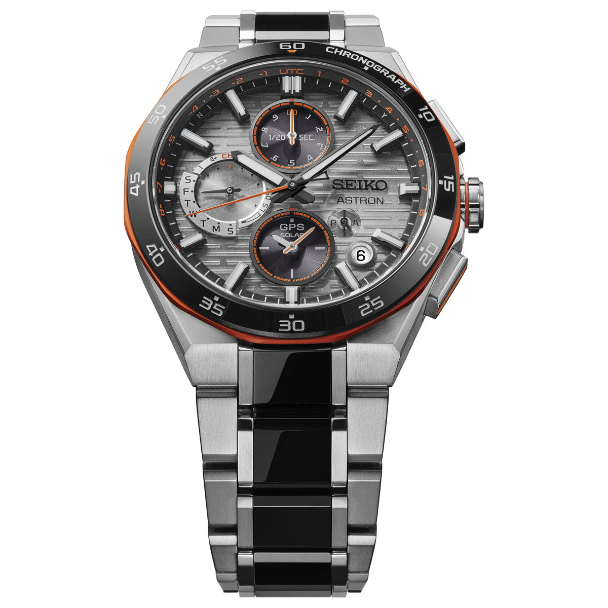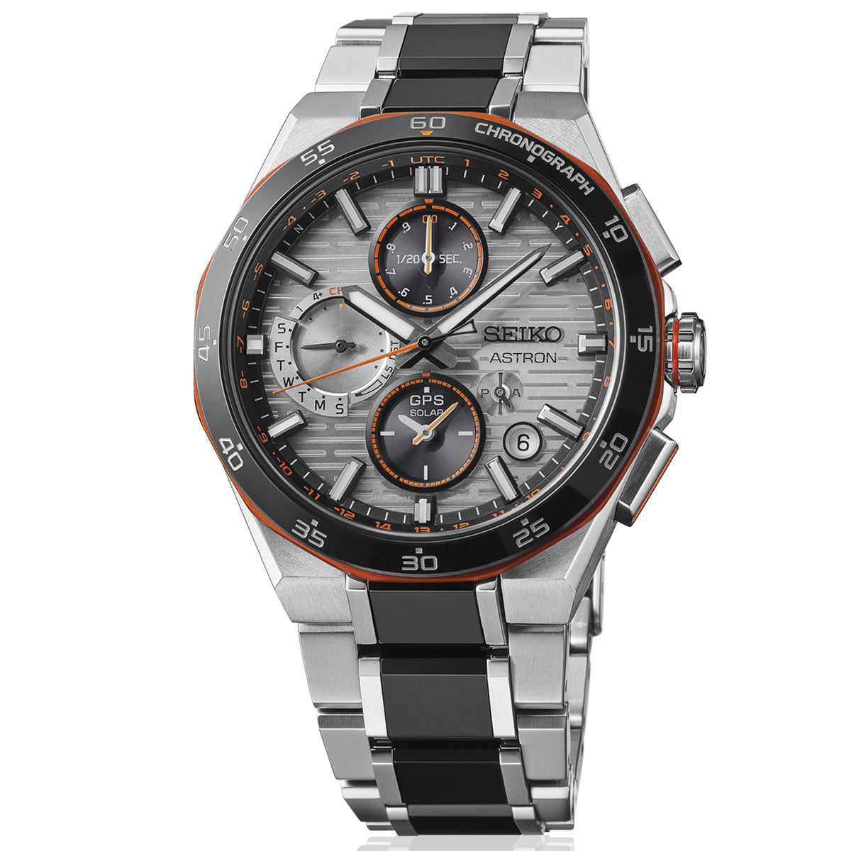 エッジの効いたカラーリングを纏ったNexter 2025 Limited Editionが登場!トレンドを意識したビビッドなネオンオレンジをアクセントカラーに採用した近未来的なカラーリング。二体構造のベゼルは、セラミックスパーツと多角形状のアルミ飾り縁を組み合わせた、レギュラーモデルにはない特別仕様。ダイヤルには、駆け抜ける光をイメージした質感の高い特徴的な横縞の型打ちパターンを採用。ベゼル、ブレスレット中駒にブラックセラミックスを採用したASTRON王道のスポーティデザイン。