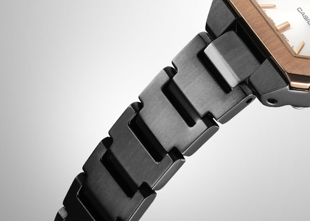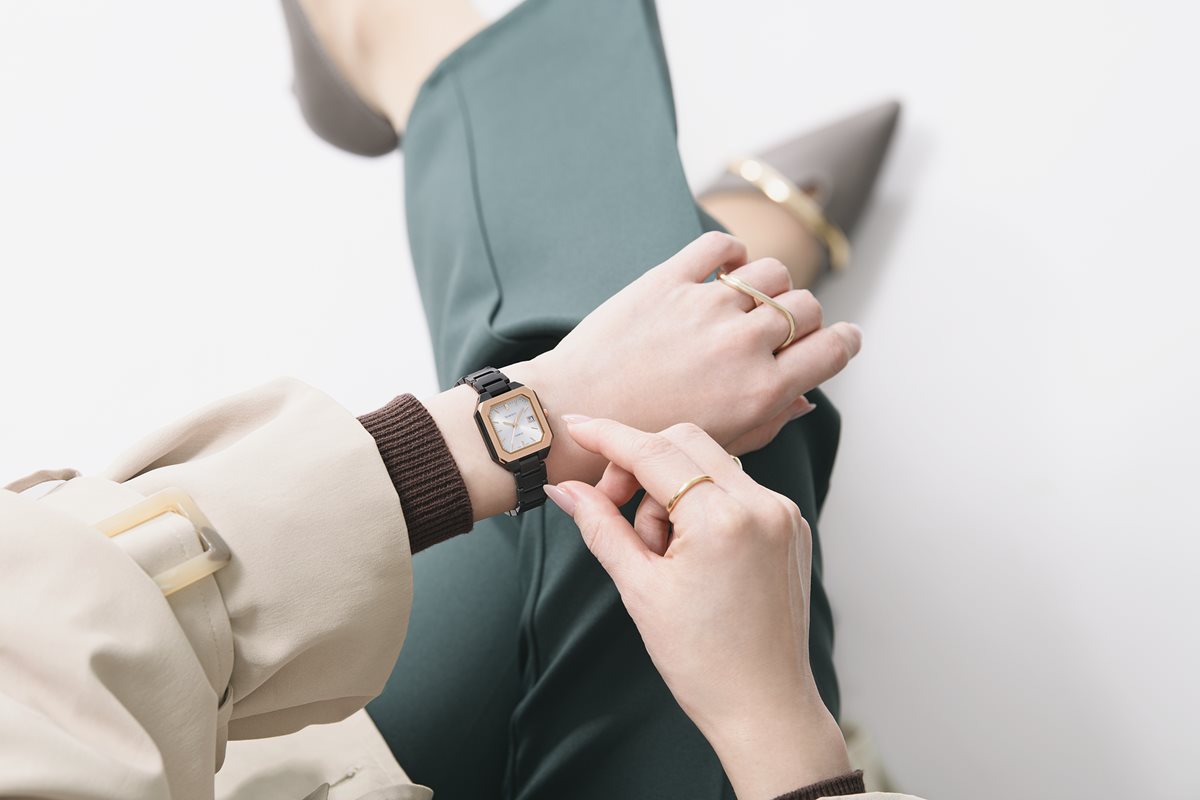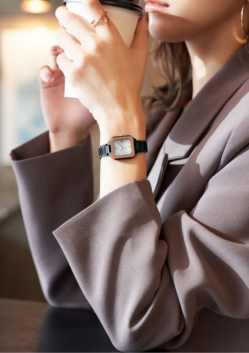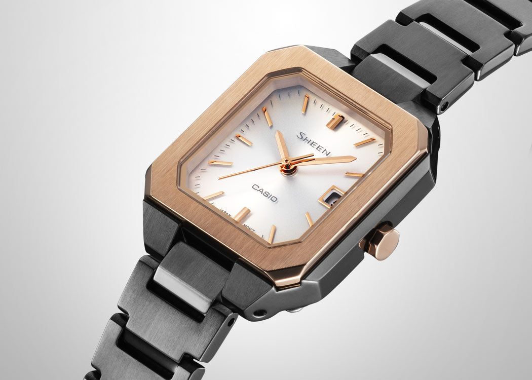 エレガントとクールが融合した新型モデルです。ブラック×ピンクゴールド、ダークグレー、シルバーの3タイプをご用意。ベゼルはヘアライン仕上げ、ケース側面はミラーで仕上げることでマニッシュな印象に。電池交換の手間が軽減するソーラー充電システムや日付表示機能を搭載。また、傷付きにくい高硬度の反射防止コーティングサファイアガラス、5気圧防水機能も採用しています。