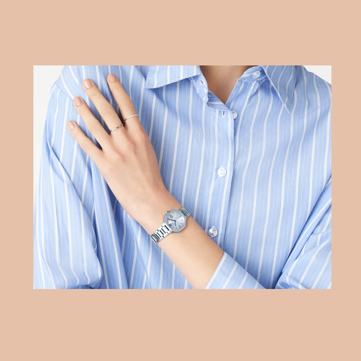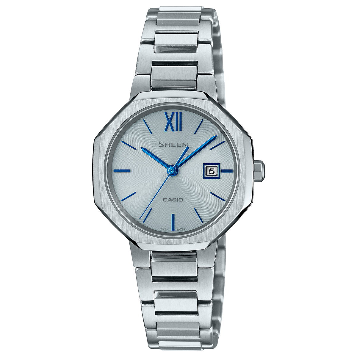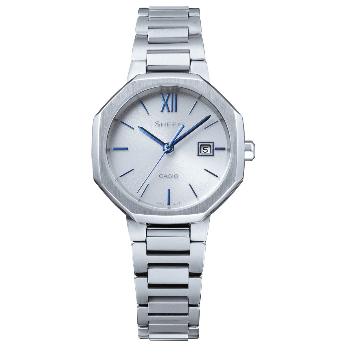 クールとエレガントが融合したSHEENの新型モデルです。マニッシュな服装に合わせやすい、シルバーをご用意。フェイスはシンプルな丸ダイアルに八角形のケースを合わせることで、シャープでエレガントな印象に仕上げました。ベゼル・バンドの天面はヘアラインで仕上げ、ベゼルケース側面はミラー仕上げにすることで質感を高めています。機能面では定期的な電池交換の手間が軽減するソーラー充電システムや日付表示を搭載。また、傷付きにくい高硬度の反射防止コーティングサファイアガラス、5気圧防水機能も採用しています。