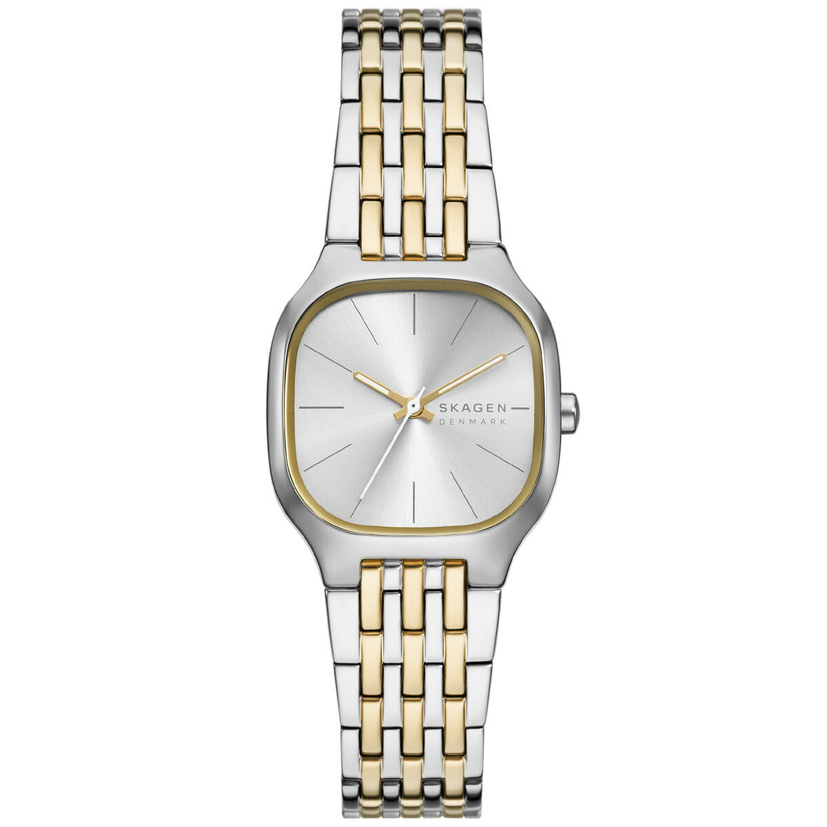 洗練されたモダンなデザインに仕上げたツートーンのステンレススチールウォッチ。存在感が際立つアイテムです。丸みのある28mmのスクエアケースに三針ムーブメントを搭載し、ゴールドトーンのサンレイダイヤルを組み合わせました。