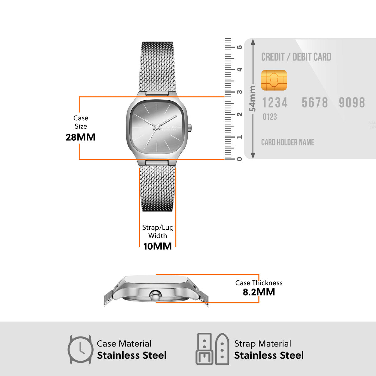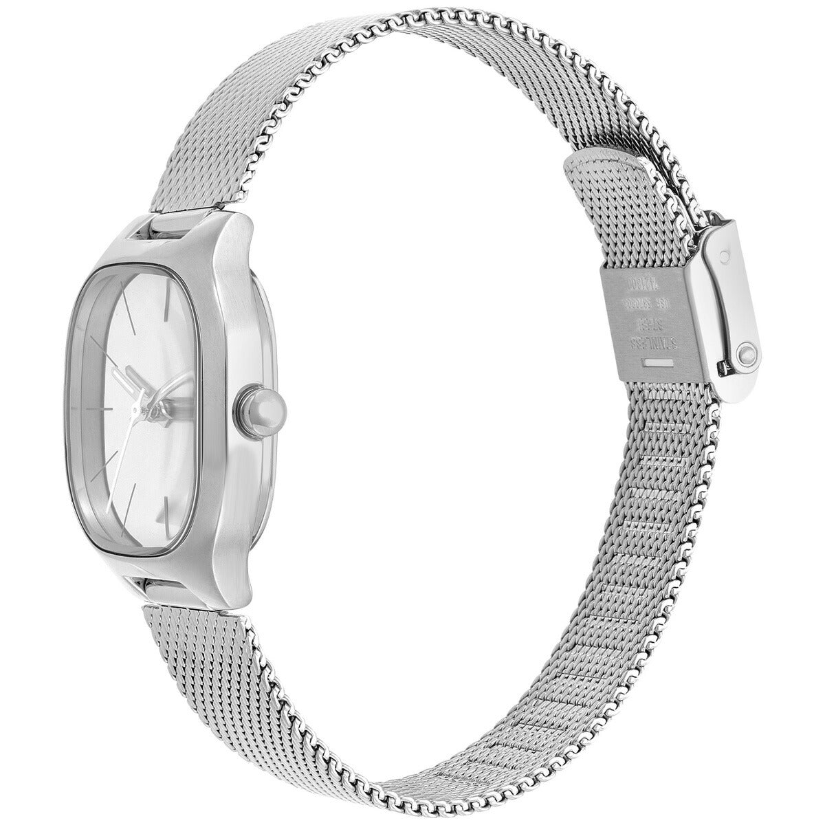 洗練されたモダンなデザインに仕上げたステンレススチール製ウォッチ。存在感が際立つアイテムです。28mmの丸みを帯びたスクエアケースは、ミラー仕上げのシルバートーンダイヤルと三針ムーブメントを搭載し、光沢のあるメッシュバンドがジュエリーのような洗練された佇まいを演出します。