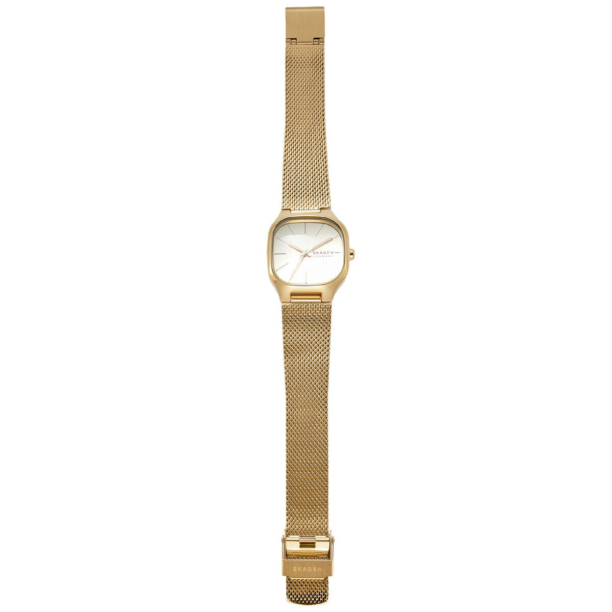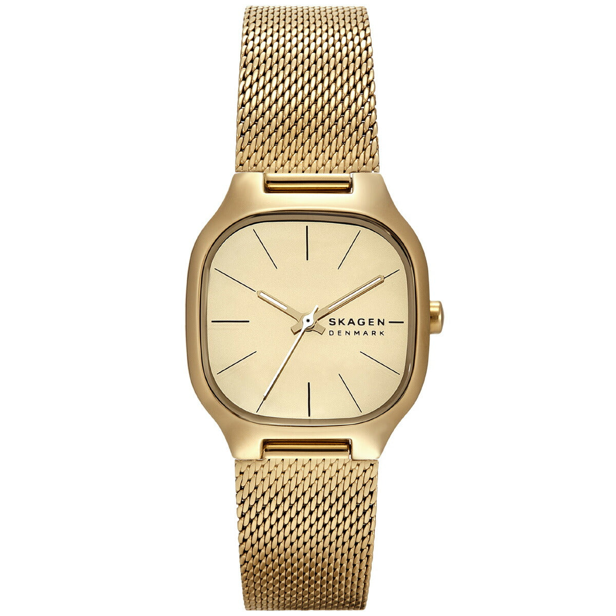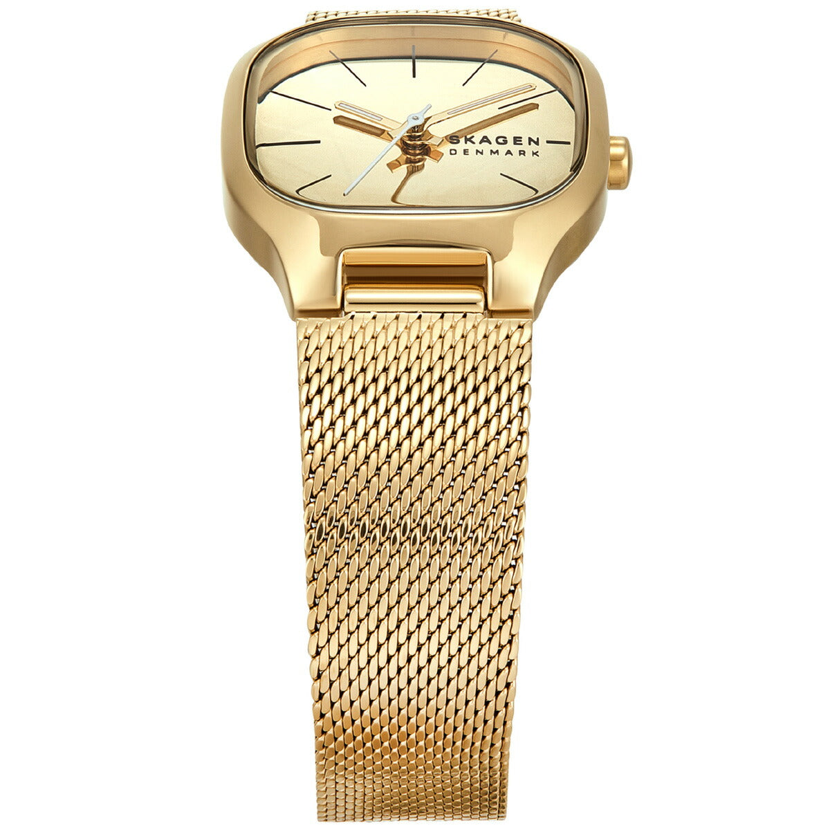 洗練されたモダンなデザインに仕上げたゴールドトーンのステンレススチール製ウォッチ。存在感が際立つアイテムです。28mmの丸みを帯びたスクエアケースは、ミラー仕上げのゴールドトーンダイヤルと三針ムーブメントを搭載し、光沢のあるメッシュバンドがジュエリーのような洗練された佇まいを演出します。