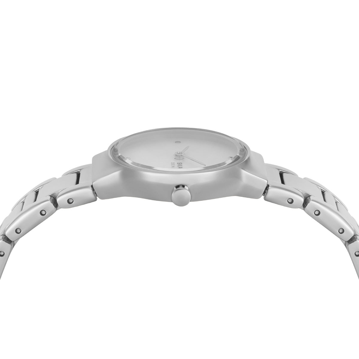 シルバートーンの小ぶりなラウンドケースに、お揃いのステンレススチール製ブレスレットをシームレスに組み合わせています。アイボリーのマザーオブパールダイヤルが、ミニマルなデザインに控えめなエレガンスを添えています。