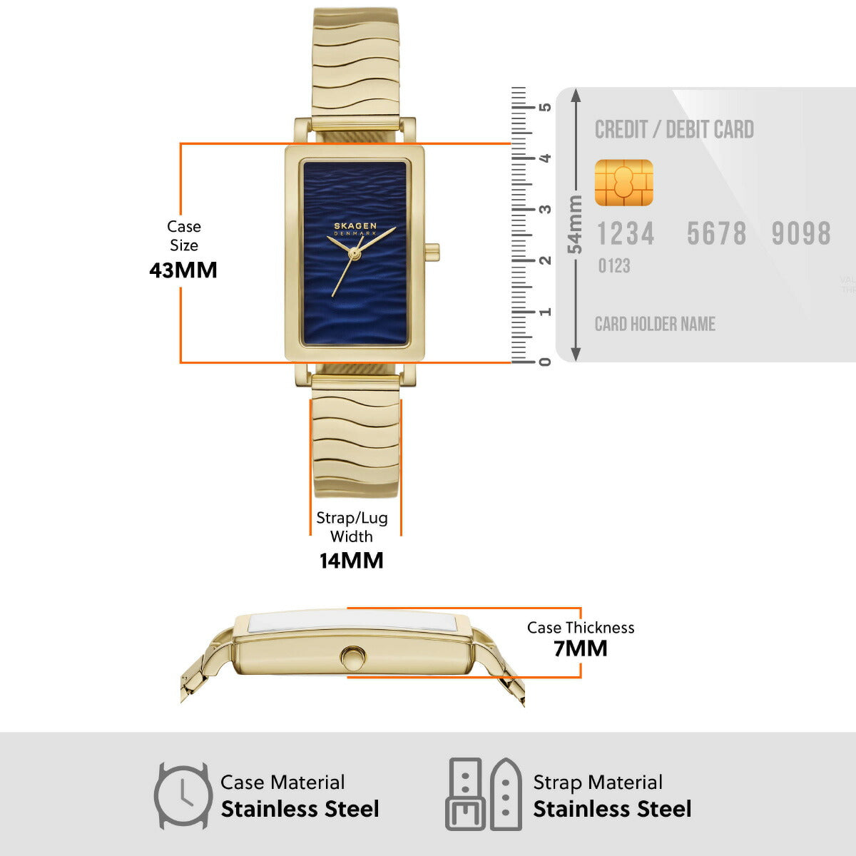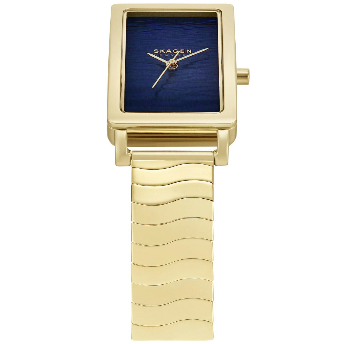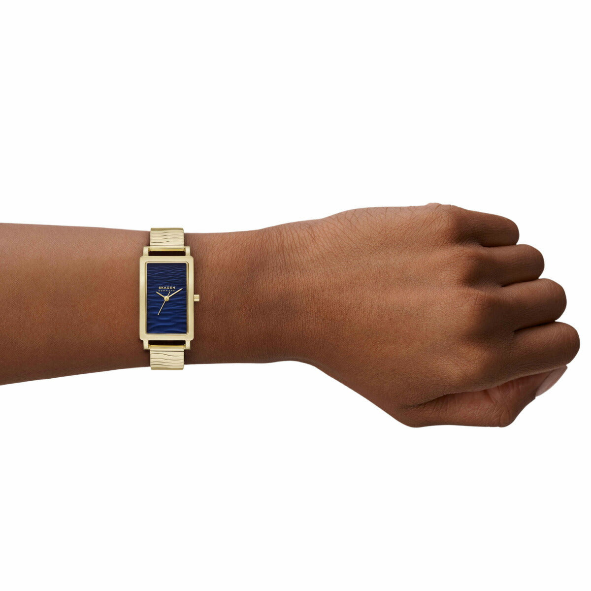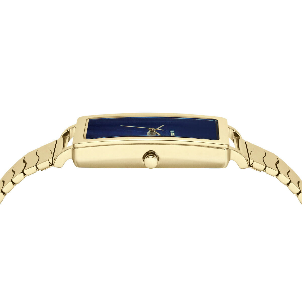 ゴールドトーンの長方形ケースに、ウェーブの質感を施したブルーダイヤルとゴールドトーンのステンレススチール製メッシュブレスレットをシームレスに組み合わせ、カラーと素材が美しく調和したデザインに仕上げています。