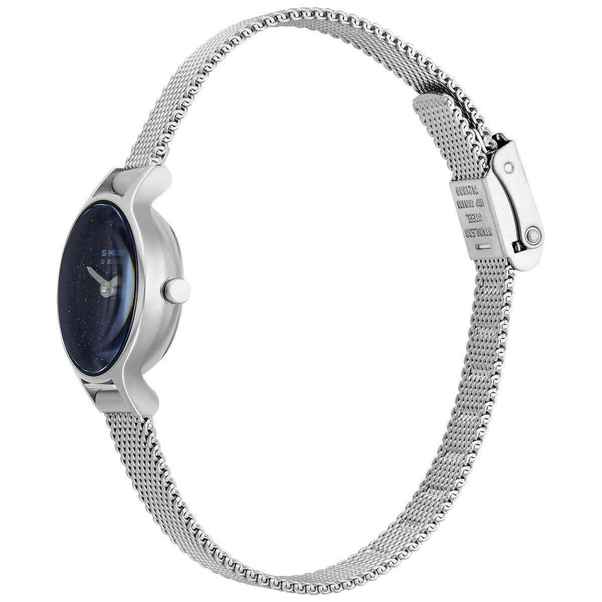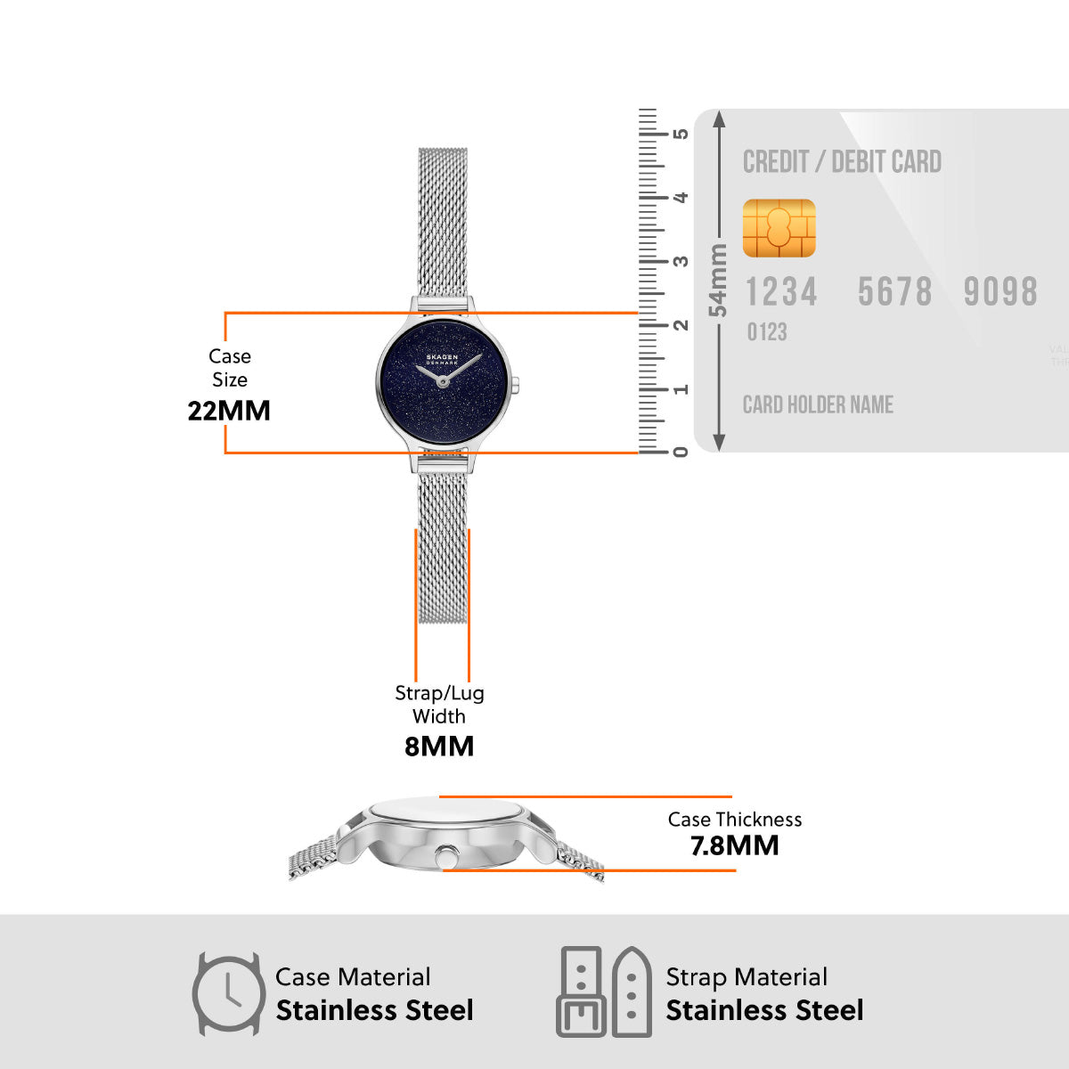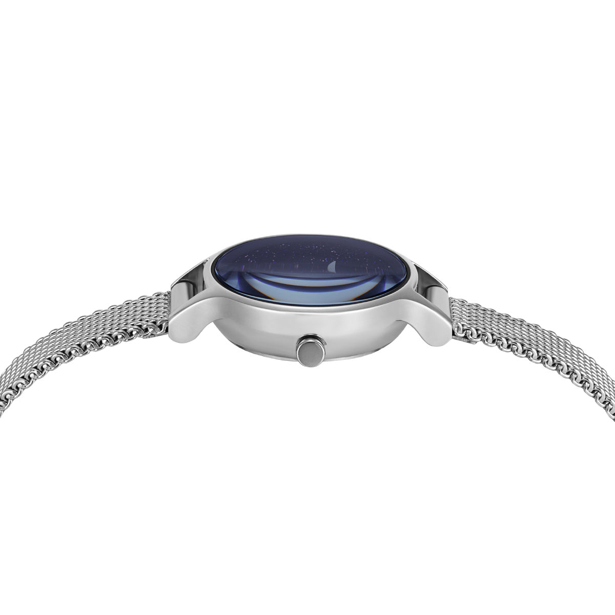 ミニマルなデザインにさりげない輝きを添えるブルーのサンドストーンダイヤルに、シルバートーンのステンレススチール製メッシュブレスレットと小ぶりなラウンドケースを組み合わせています。