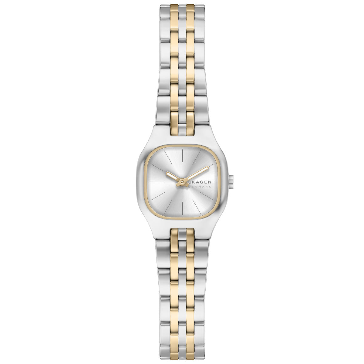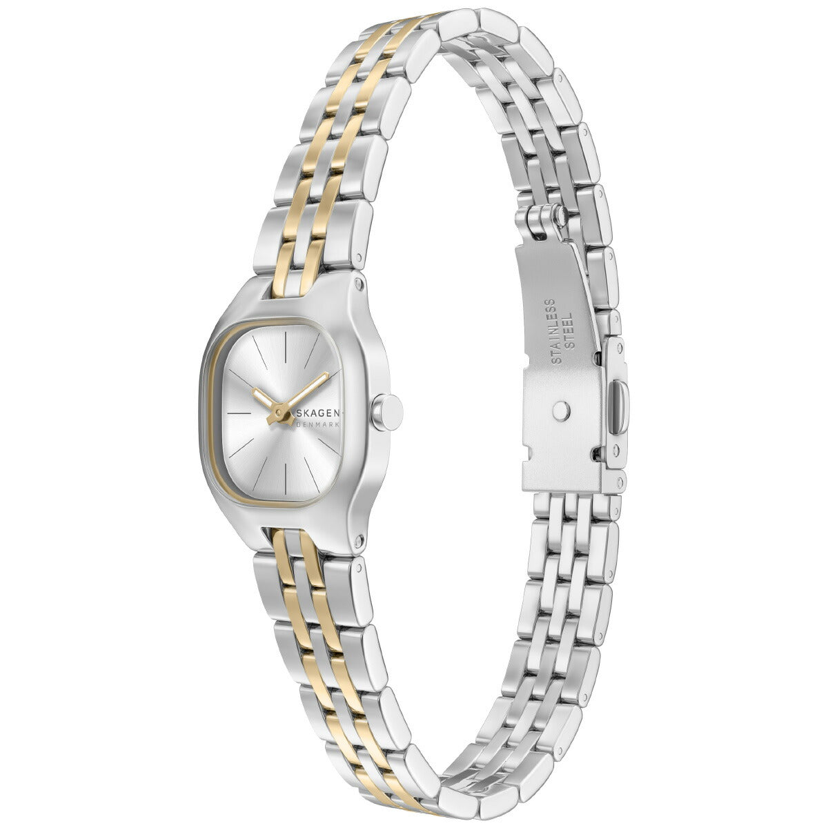 ツートーンのクッションケースとマッチするサンレイダイヤルを備えたスモールウォッチ。ツートーンのステンレススチール製ブレスレットと中折れクラスプを組み合わせています。