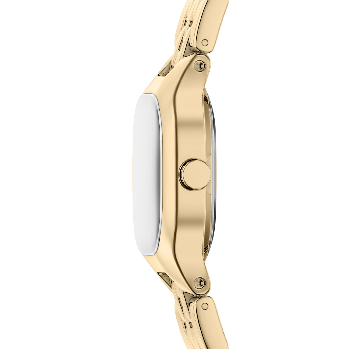 ゴールドトーンのクッションケースとマッチするサンレイダイヤルを備えたスモールウォッチ。ゴールドトーンのステンレススチール製ブレスレットと中折れクラスプを組み合わせています。