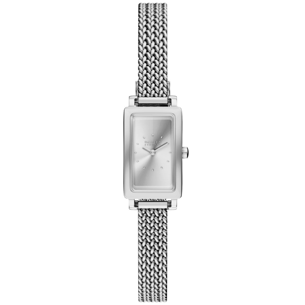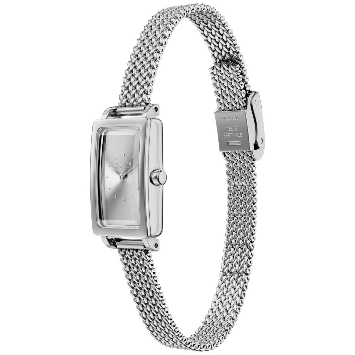 ステンレススチール製のレクタングルケースに、マッチするサンレイダイヤルとメッシュブレスレットを組み合わせ、すっきりとしたラインとミニマリストの美学が融合したタイムレスな魅力を放ちます。