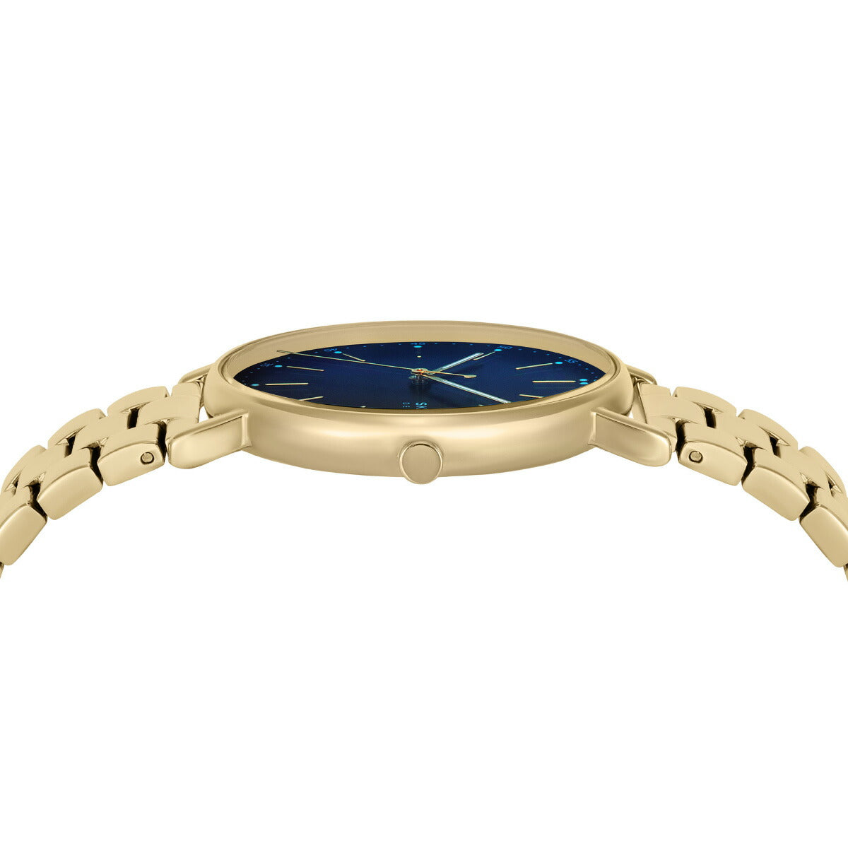 ゴールドトーンのステンレススチール製ケースとブレスレットが、ブルーのサンレイダイヤルとシームレスに組み合わされ、現代的なデザインディテールが映える、すっきりとしたミニマルな美しさを生み出しています。