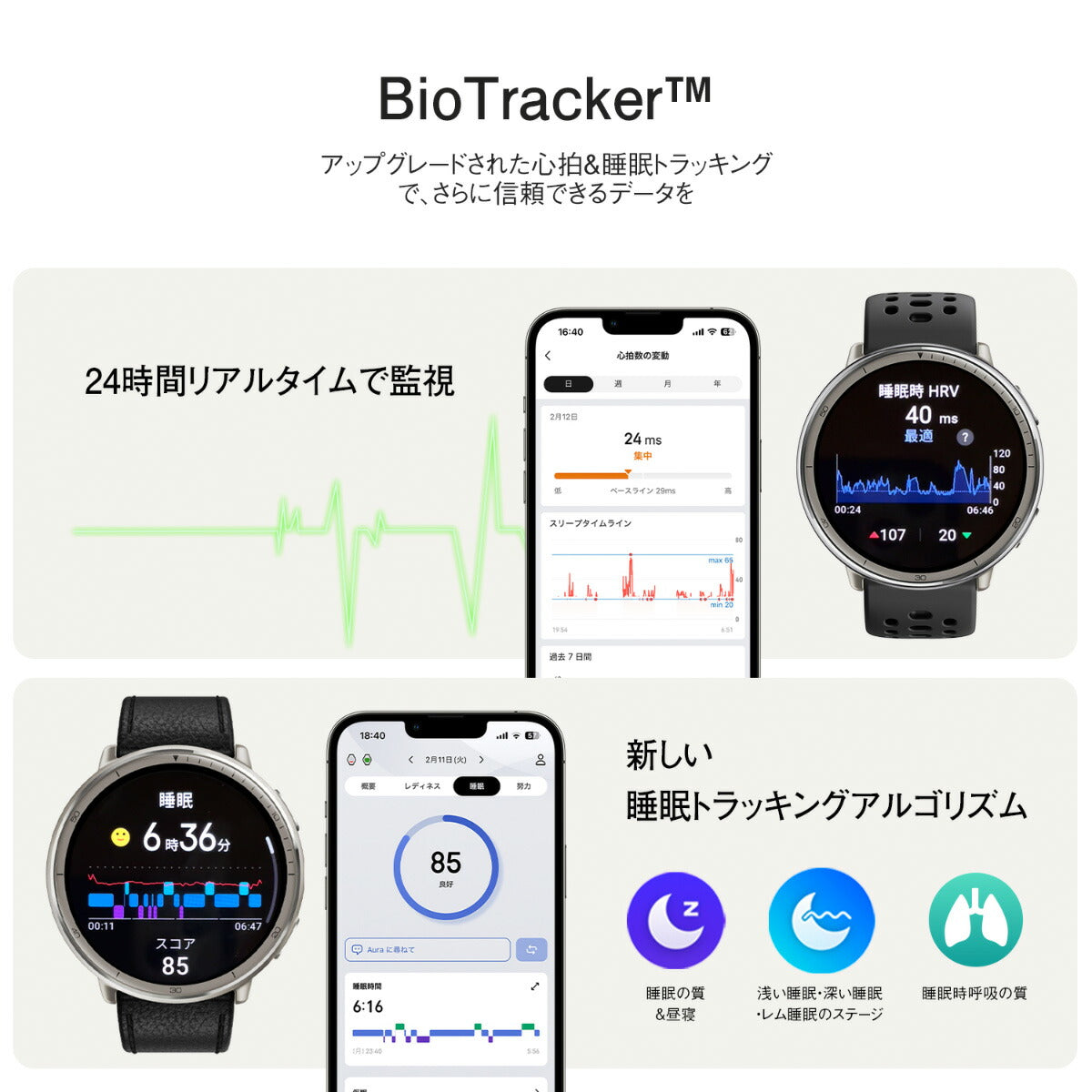 Amazfit Active 2は日常生活の究極の相棒として機能し、一日を通して運動の機会を活かすようサポートします。ジムにいるとき、自然の中でハイキングをしているとき、または単に散歩を楽しんでいるときでも、このスマートウォッチは、トレーニングを簡単に追跡し、フィットネス目標を設定し、新しい冒険に乗り出すサポートを担います。アクティブになるだけでなく、あらゆる形で運動を意識するライフスタイルを受け入れます。Amazfit Active 2は身体や精神の回復にも重点を置いており、睡眠を監視して、目覚めたときに元気を取り戻し、新たな1日に取り組む準備ができていることを確認します。このスマートウォッチがあれば、ただ生活をしているだけでなく、すべての瞬間を前向きに過ごし、心身の健康を充実させることができます。