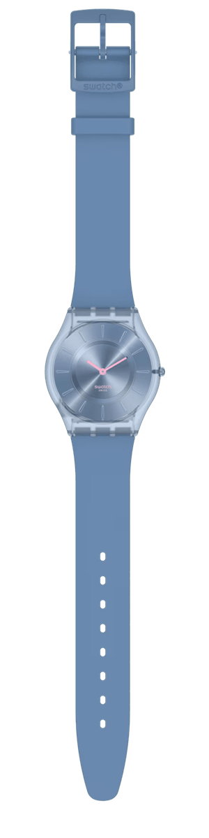 日に焼けたヒヤシンスブルーの文字盤を、ピンクのプリントが誇示。洗練された SKIN CLASSIC の美をご覧ください!