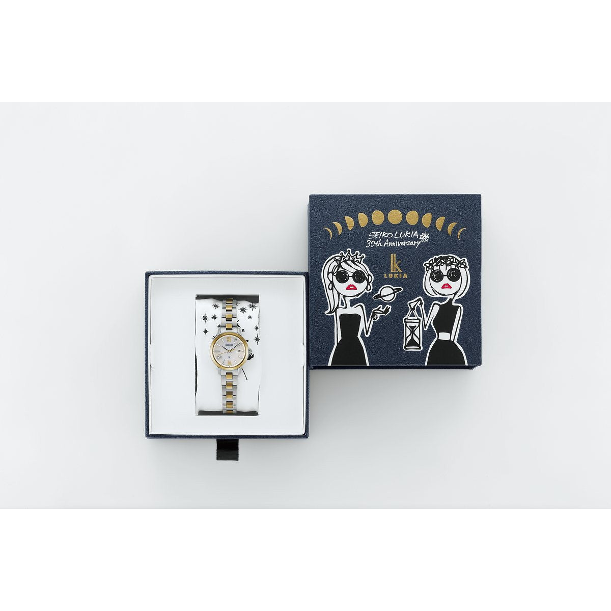 ブランド30周年を締めくくるルキアとELAIZA IKEDA、DAICHI MIURAとのトリプルコラボレーションモデルテーマは「星月夜(ほしづきよ)」。モデルは池田エライザさんとの共同開発、パッケージは人気アーティストの三浦大地さんデザイン。エライザさん憧れの神話の世界を、神秘的な星月夜をイメージしたデザインで表現しました。パッケージは、「星月夜」のテーマに合わせて三浦大地さんがトータルデザイン。女性に大人気のキャラクター「Josie」を用いて「星月夜」を表現しました。エライザさんをイメージした「Josie」も登場するクロスとボックスが、コラボレーションモデルならではの特別感を高めています。