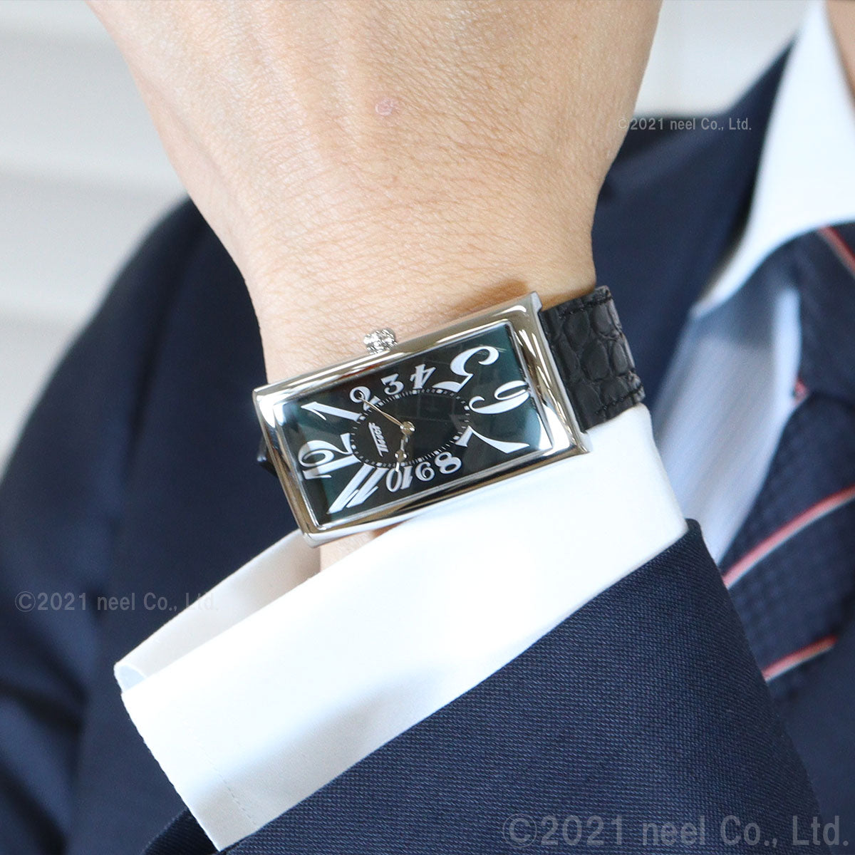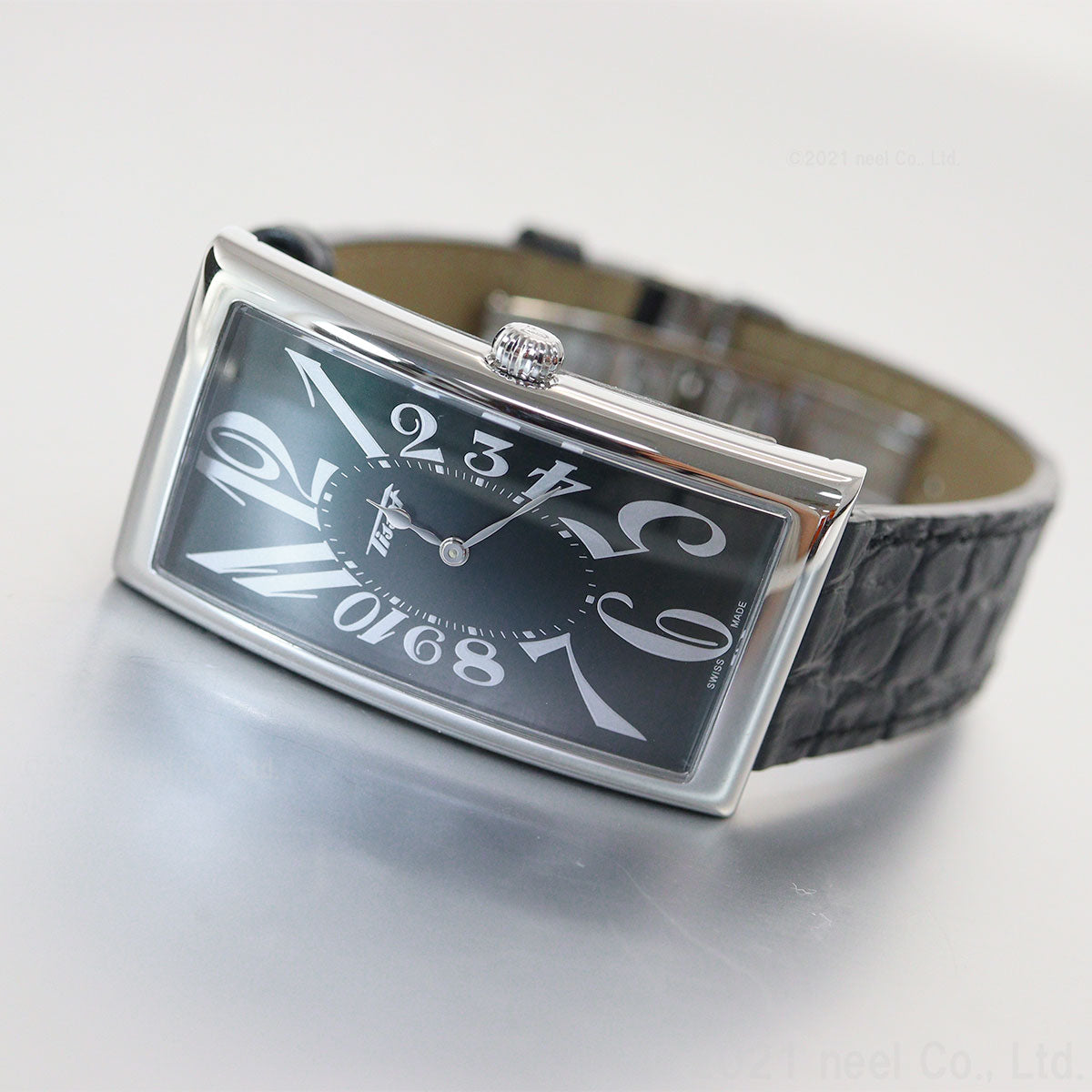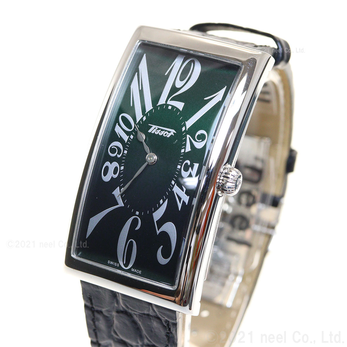 1916年に誕生し、「バナナ・ウォッチ」の呼称で愛される、TISSOTを代表するアイコニックモデル。手首に沿うよう緩やかにカーブし着用感を高めるケースシェイプ、そしてダイアル中央から放射状にデフォルメされたインデックスがアール・ヌーヴォー時代を彷彿とさせます。深いグリーンのダイアルにアリゲーター柄のブラック型押しレザーストラップを組み合わせたシックなコンビネーション。見る角度や光の加減によっては、時としてまるで漆黒のようにも見える深く美しいグリーンのダイアルと華やかなアリゲーターパターンが腕元に時計以上の存在感を演出します。