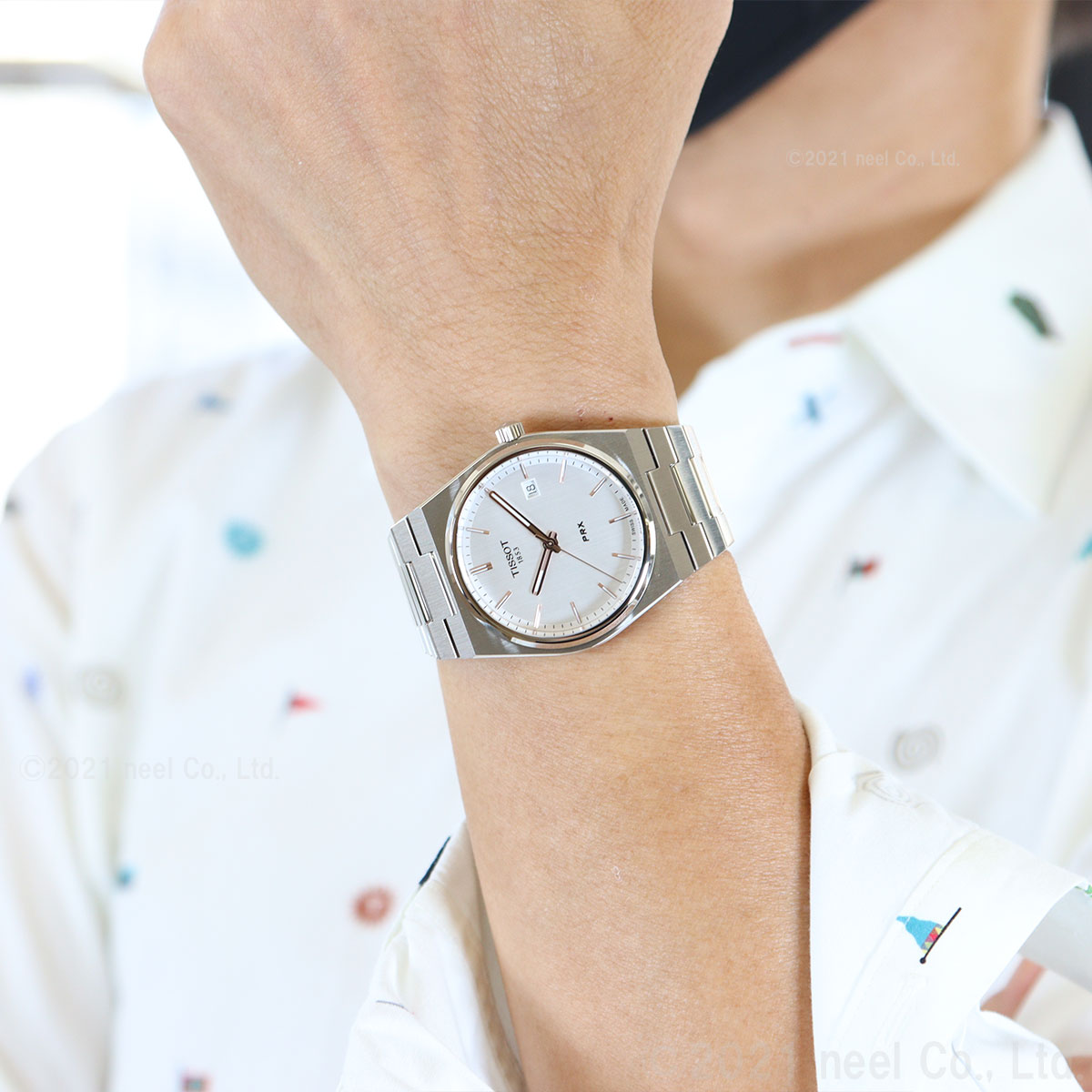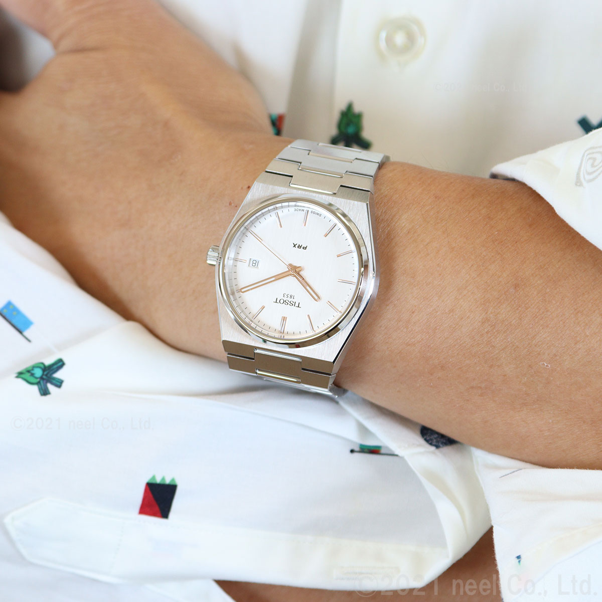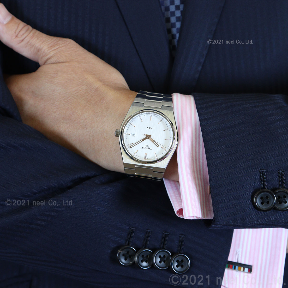 ソリッドな質感とスリムな一体型デザインが際立つPRX[ピーアールエックス]は、1978年のオリジナルモデルを再解釈し、より洗練され、より高精度にアップデートしたコレクション。ケースとブレスレットが一体化した薄型の特徴的なデザインはヴィンテージ感がありながらも斬新でスタイリッシュな、時代を超越するタイムピースです。 その名に”Precise and Robust(高精度かつ堅牢)”という意味を持ち、“X”で10気圧防水性能を表すPRXの、ケースからブレスレットに向かって幅広のリンクへとシームレスに変化を遂げる滑らかで美しいライン。40mm径のケース中央ではポリッシュ仕上げのベゼルが冷たくも艶やかな光沢を放ち、そこからサテン仕上げのケースへと、あえて垂直ではなく斜めに自然につなげていくという細やかなディテールへの徹底したこだわり。全体に施された繊細な仕上げの技巧にはティソが長い歴史の中で培ってきたクラフトマンシップが如実に表れています。また、デザインのみならず、機動性と柔軟性による人間工学に基づいて開発されたブレスレットのスムーズなフィット感と腕になじむ薄型ケースという実用面も併せもち、オーナーは抜群の着用感を体感できます。腕元を明るく演出するシルバーグレーダイアルにローズゴールドのインデックスのコンビネーションに、Super-LumiNovaコーティングの蓄光針が視認性を高め、滑らかな着用感とデイリーに使いやすい10気圧防水性能を備えたTissot PRX。身につけるアイテムにこだわる人のために生まれた、時代を超越するタイムピースです。