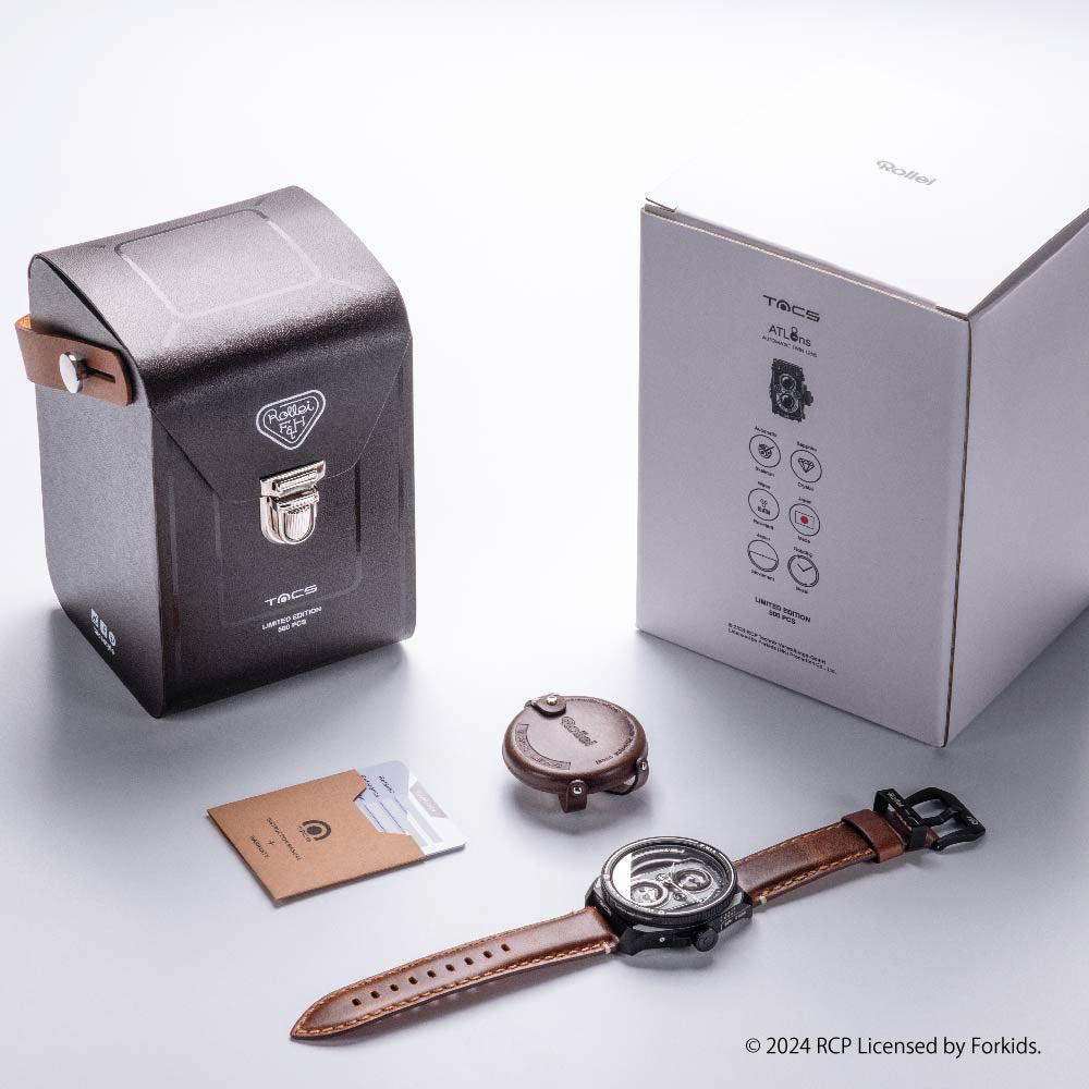 日本発のデザインウォッチブランド「TACS(タックス)」がドイツのカメラブランドRolleiが手掛けた伝説の二眼カメラ、「Rolleiflex(ローライフレックス)」にインスパイアされた新商品ATL×Rolleiスペシャルボックス(世界限定500個)。これはデザインと精度への拘りを大切にするTACSとRolleiの特別なコラボレーション作品です。ドイツの歴史あるカメラブランドRolleiは、長年にわたり写真の世界で革新的な存在でした。TACSは、繊細で洗練された時計デザインと、Rolleiの象徴的なツインレンズ技術を組み合わせ、時計とカメラ、両方に敬意を表する特別なモデルを作り上げました。この傑作は、時を刻むアートと瞬間を捉える技術が見事に結びついています。日本の卓越した技術で製造され、精度とディテールに拘るATL×Rollei。ケースとストラップに施したDLC(ダイヤモンドライクカーボン)コーティングは、時計の耐久性を高め、長期間にわたり時計本体を保護し形状を保ち続けます。アップグレードされた根本夜光を搭載した文字盤は、暗闇でも鮮やかに輝き、実用性とデザイン性を完璧に融合させました。上質なメキシカンレザーを使用したストラップは、ソフトで耐久性があり、快適な付け心地をサポートします。バックル部分には、Rolleiのロゴが、リューズにはTACSのロゴが刻まれ、洗練された印象を与えます。世界限定500個という希少性も大きな魅力、1つ1つの時計には、限定の証であるシリアルナンバーが刻印されます。カメラの歴史に刻まれた伝説と、日本の時計製造の技術が融合したこの時計は、ただのタイムピースではなく時代を超えた特別な作品です。写真愛好家や時計コレクターにとって、両方の世界に敬意を表する特別なアイテムとなるでしょう。
