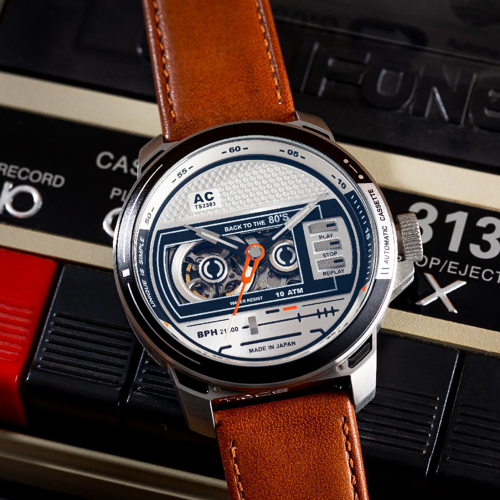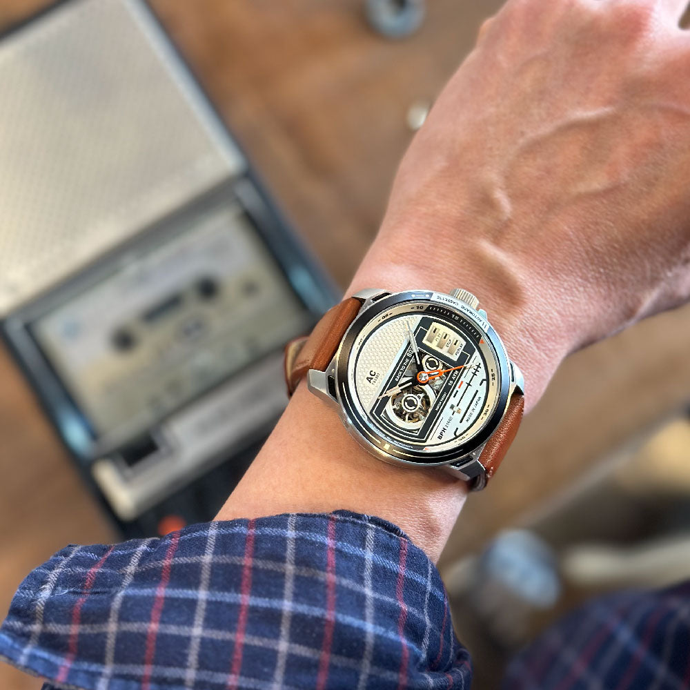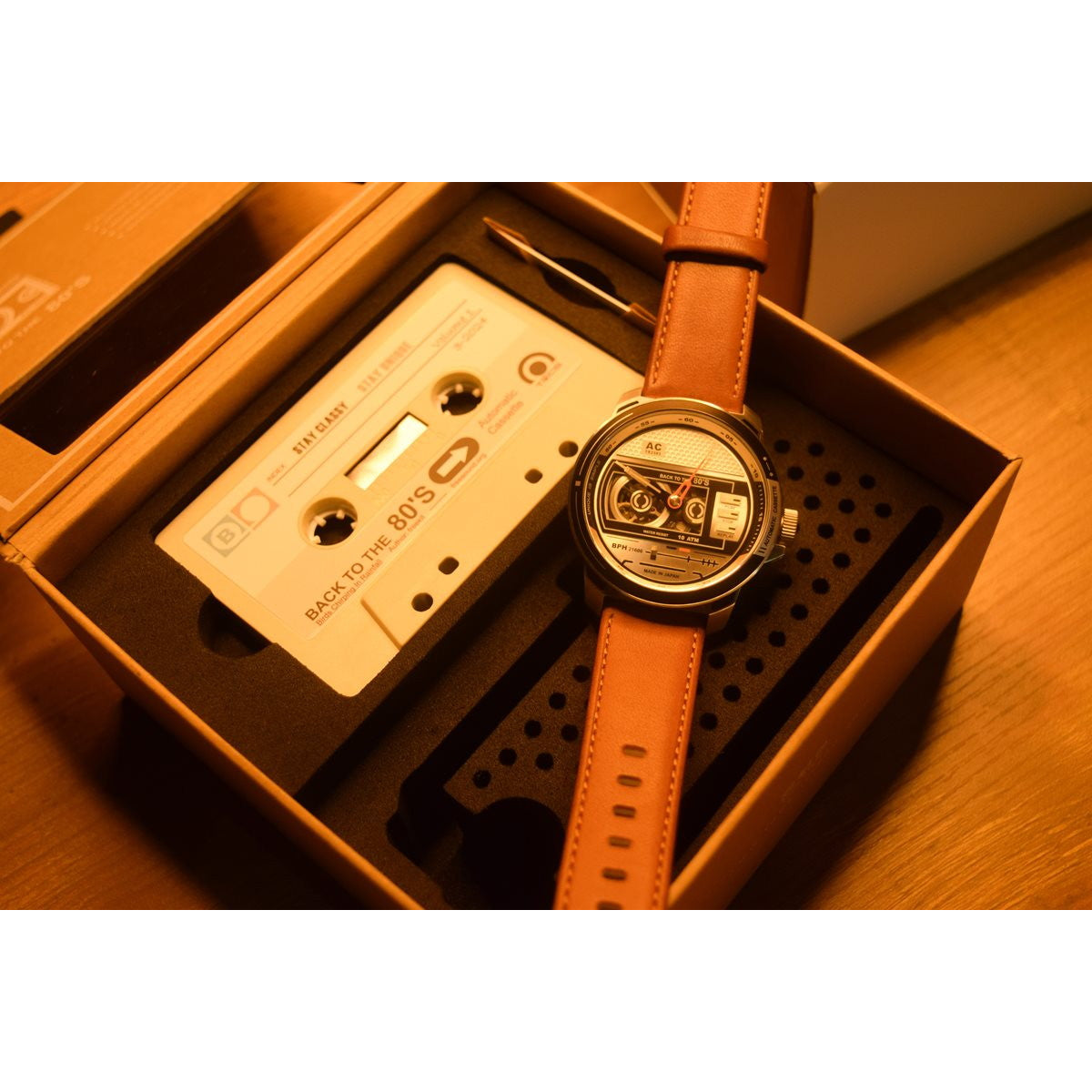 レトロな80年代のカセットテープをモチーフにしたノスタルジックで品格のあるオートマティックカセットクラシックなカセット・プレーヤーを腕時計に取り入れ、透明なカセットデッキのカバーや、再生、一時停止、停止機能のボタンなどのデザイン素材も含まれています。ボリューム・コントロール・ノブを模したリューズを備え、ライン・インとライン・アウト・プラグのレプリカのディテール、そしていくつかのカセット・プレーヤーに見られるラジオ機能を彷彿とさせるディテールが特徴です。カセット・プレーヤーを思い起こさせるデザインを時計のデザインに取り入れることで、音楽愛好家の大切なひとときの思い出を呼び起こし、ヴィンテージの魅力とセンチメンタルな価値を現代的なデザインに融合させることを目指しています。このレトロブームは、単なる懐古趣味ではなく、現代のライフスタイルに新たな彩りを加えるトレンドです。特別特典BOX SET ボックスセットには、鳥のさえずりが心地よく響く本物のカセットテープが付属します。