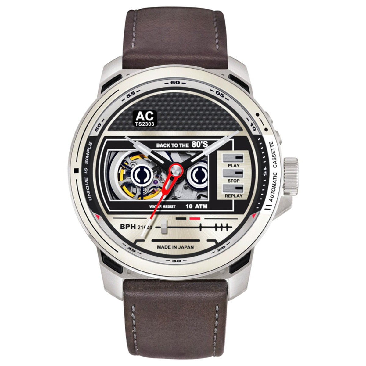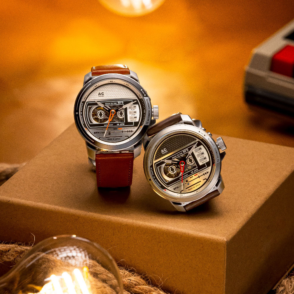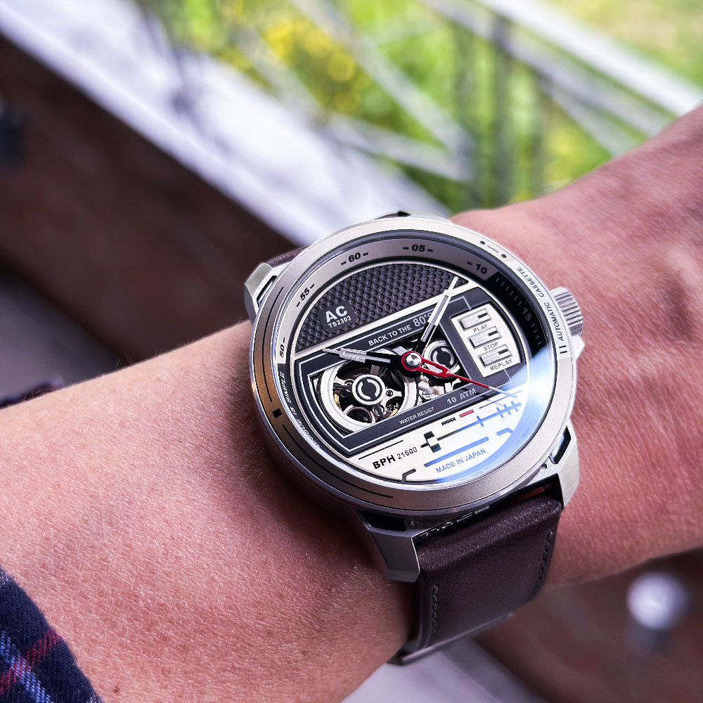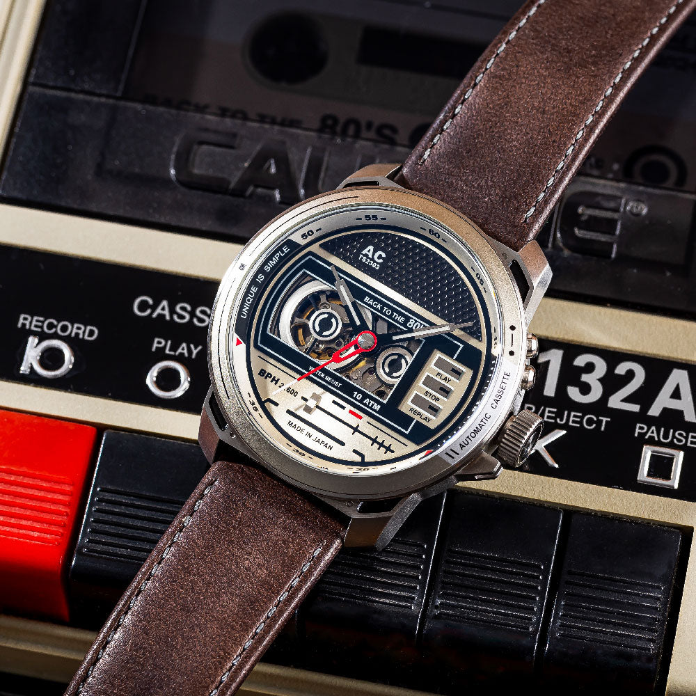 レトロな80年代のカセットテープをモチーフにしたノスタルジックで品格のあるオートマティックカセットクラシックなカセット・プレーヤーを腕時計に取り入れ、透明なカセットデッキのカバーや、再生、一時停止、停止機能のボタンなどのデザイン素材も含まれています。ボリューム・コントロール・ノブを模したリューズを備え、ライン・インとライン・アウト・プラグのレプリカのディテール、そしていくつかのカセット・プレーヤーに見られるラジオ機能を彷彿とさせるディテールが特徴です。カセット・プレーヤーを思い起こさせるデザインを時計のデザインに取り入れることで、音楽愛好家の大切なひとときの思い出を呼び起こし、ヴィンテージの魅力とセンチメンタルな価値を現代的なデザインに融合させることを目指しています。このレトロブームは、単なる懐古趣味ではなく、現代のライフスタイルに新たな彩りを加えるトレンドです。特別特典BOX SET ボックスセットには、鳥のさえずりが心地よく響く本物のカセットテープが付属します。