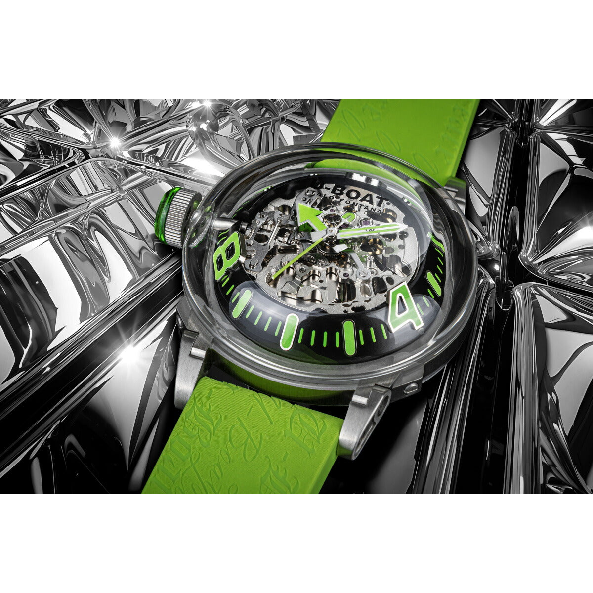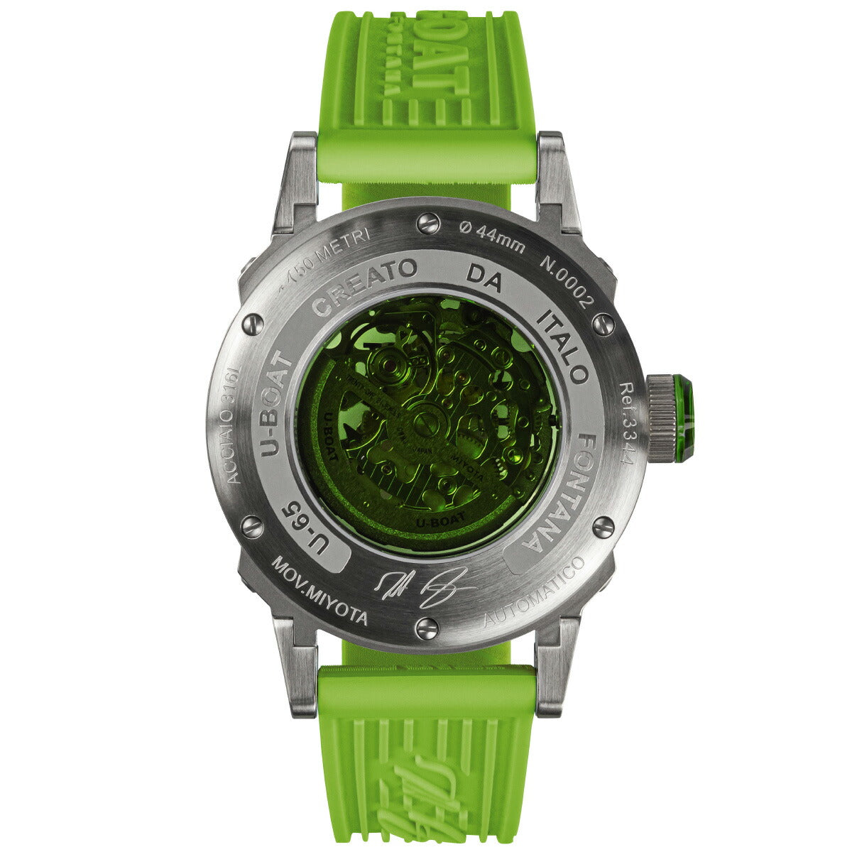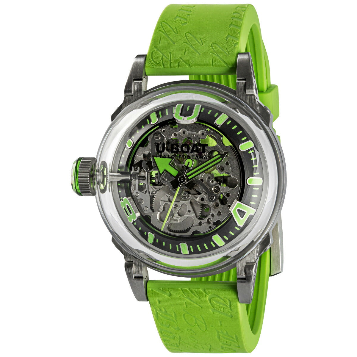 戦闘用プロフェッショナルウォッチをルーツに持つU-BOAT。超ドーム型ミネラルガラス、完璧な視認性、あらゆる手首にフィットする特許取得の可動式ラグ。ガラスインサート付きのリューズはイタロ・フォンタナのアイコンであるレフトハンドリューズを更に独創的なものにしています。