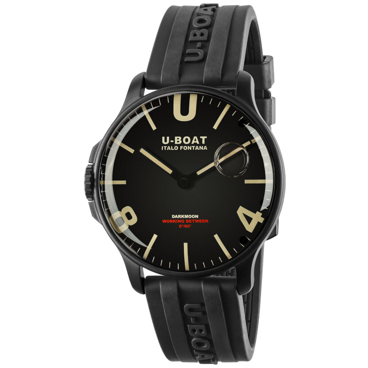 戦闘用プロフェッショナルウォッチをルーツに持つU-BOAT。この「ダークムーン」は、風防内にオイルを注入することでダイヤルが文字盤と一体化したかのような視覚効果をもたらすと共に、抜群の視認性を実現しています。「ダークムーン」の名の通り、暗い月の色彩にインスパイアされたダイヤルデザイン。