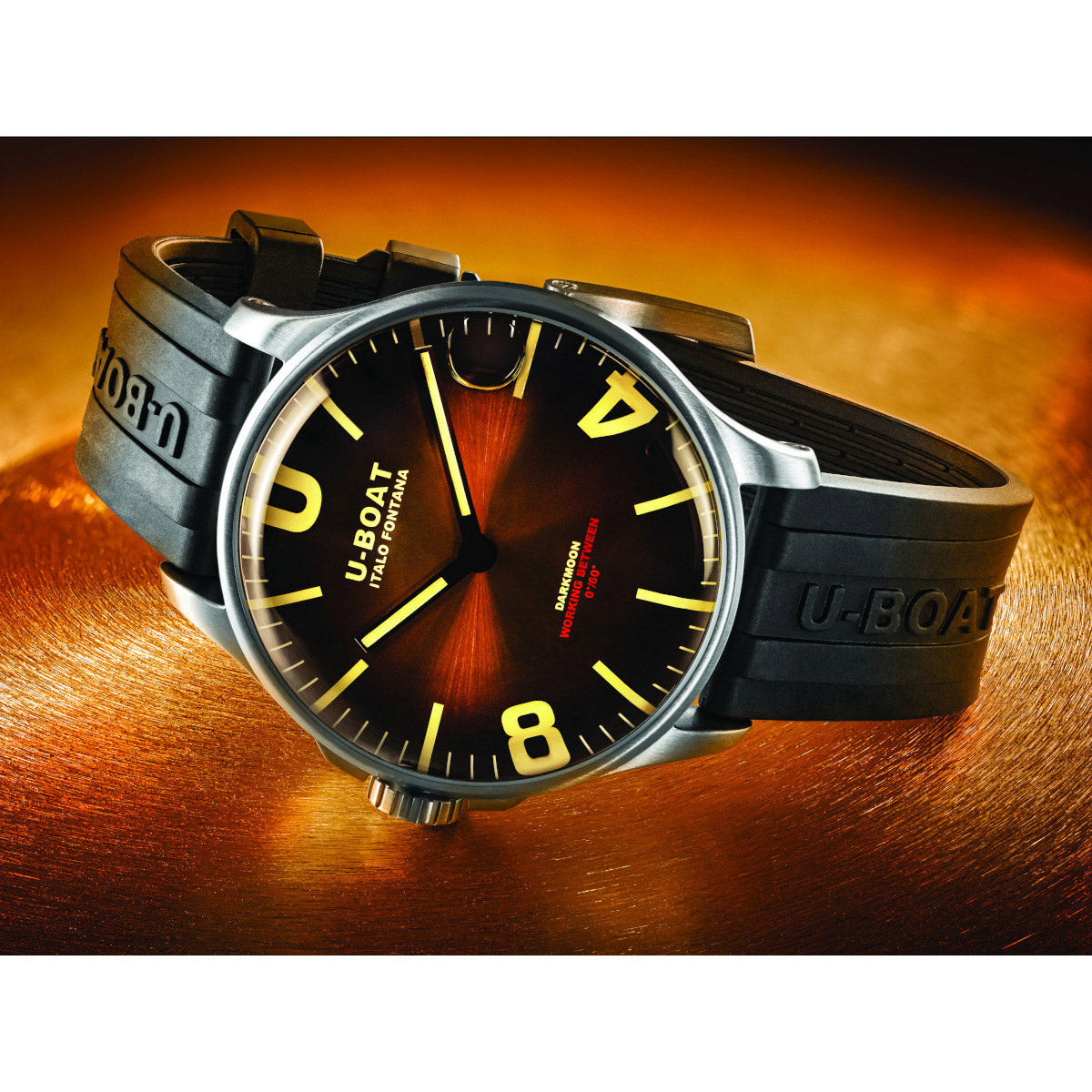 戦闘用プロフェッショナルウォッチをルーツに持つU-BOAT。この「ダークムーン」は、風防内にオイルを注入することでダイヤルが文字盤と一体化したかのような視覚効果をもたらすと共に、抜群の視認性を実現しています。「ダークムーン」の名の通り、暗い月の色彩にインスパイアされたダイヤルデザイン。