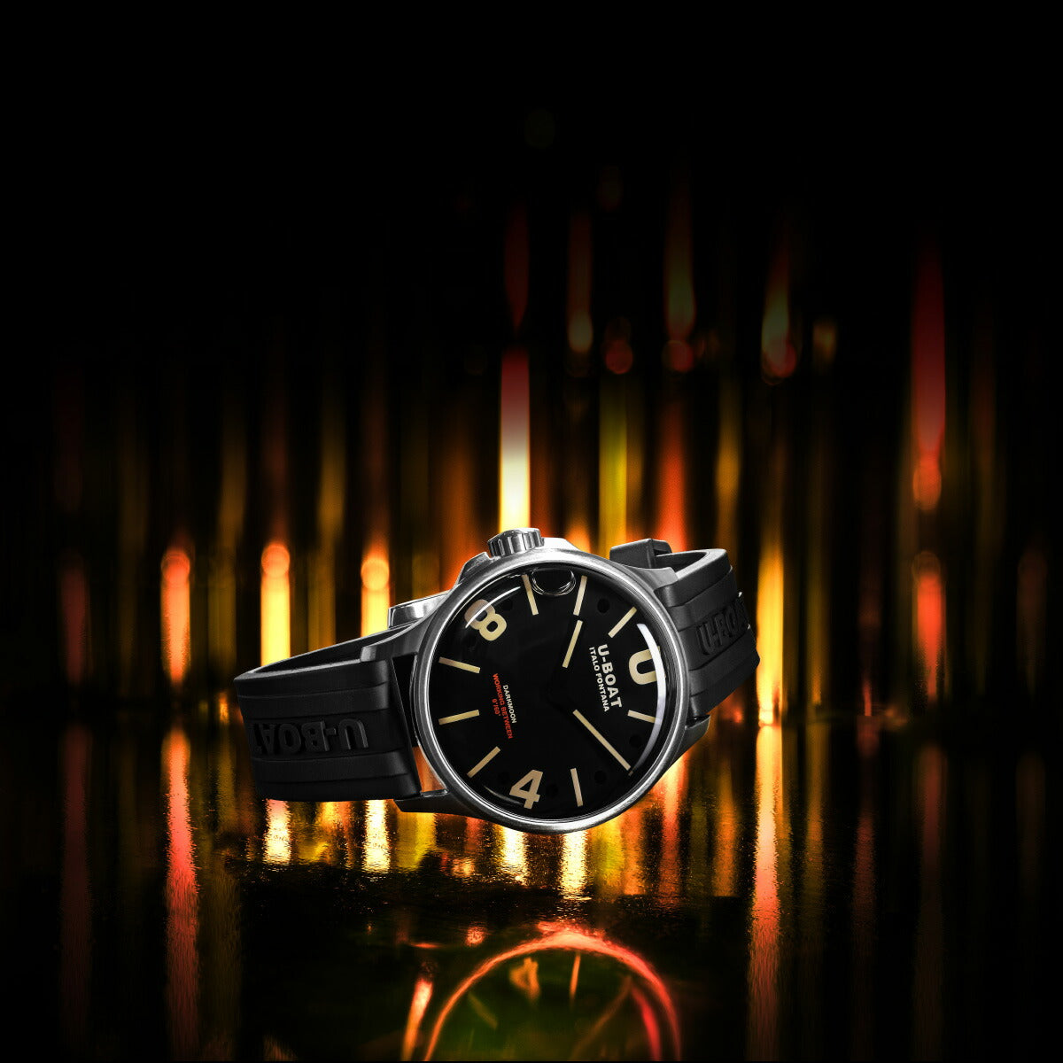 戦闘用プロフェッショナルウォッチをルーツに持つU-BOAT。この「ダークムーン」は、風防内にオイルを注入することでダイヤルが文字盤と一体化したかのような視覚効果をもたらすと共に、抜群の視認性を実現しています。「ダークムーン」の名の通り、暗い月の色彩にインスパイアされたダイヤルデザイン。