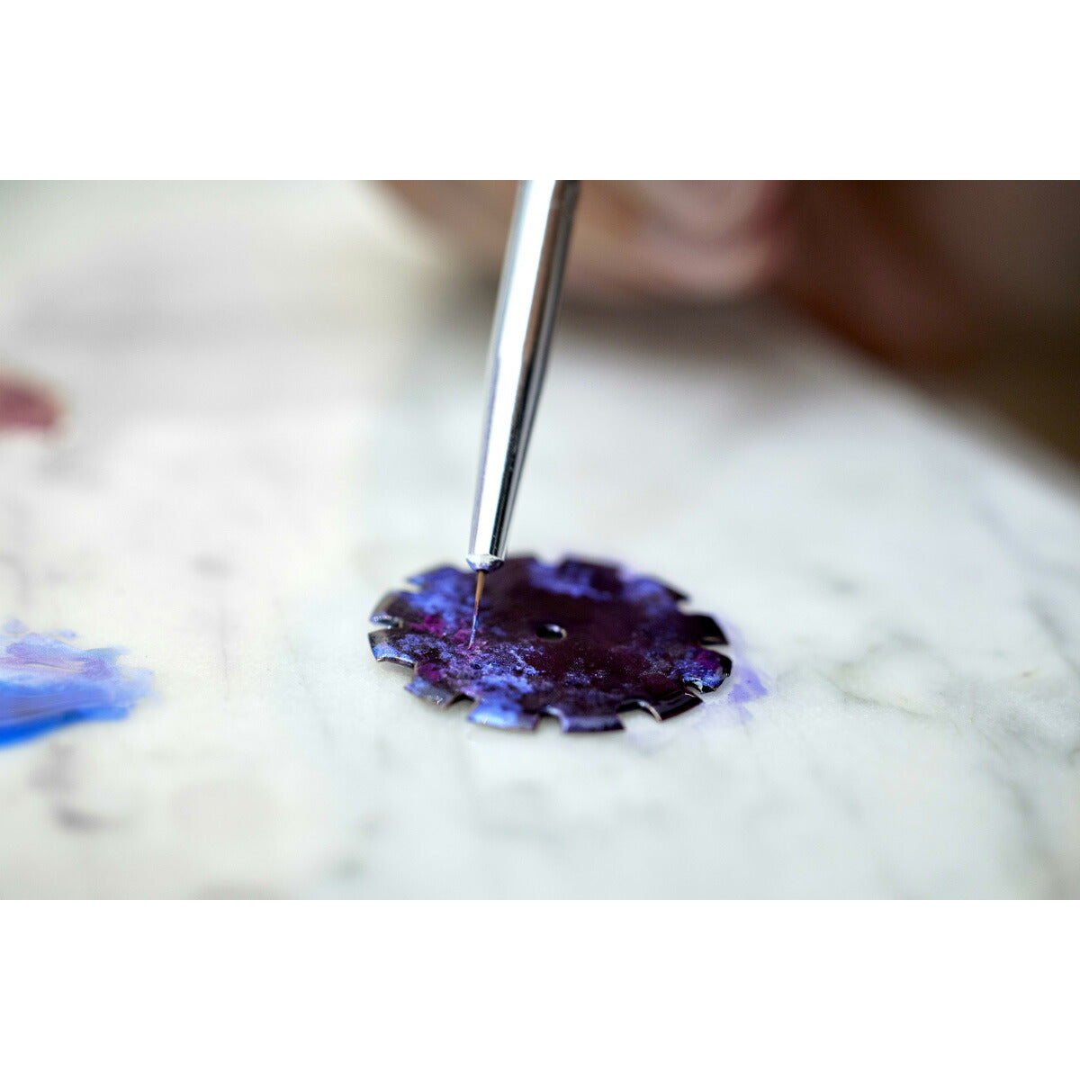 「悠彩文字盤」は、現代美術家である高屋永遠氏とMINASEが共同製作をするMINASEの新たなJAPAN ART COLLECTIONです。「悠」は、悠久・悠然とした時の流れを象徴し、直線的な時間の経験とは異なり、永遠的で、ゆるやかに循環するような時間の奥行きを表します。「彩」は、色彩そのものが持つ揺らぎや多層性を意味し、光が反射し、見る角度や環境で異なる表情を見せる彩りは、時間がもたらす「揺らぎの美学」を意味します。光と色彩の揺らぎを通して時間の奥行きを映し出し、時間の中に潜む不可視の豊かさを体感できる現象的な「悠彩文字盤」が、MINASEが誇るザラツ研磨の輝きを放つ時計ケースの中に収まることで、時のアートが完成します。悠彩文字盤はひとつひとつ高屋永遠氏が描いています。同じ文字般はひとつも無く、掲載されているイメージ写真と差異がありますことを、予めご了承ください。正面写真外のイメージ写真は、文字盤の色や、その他仕様が異なっている場合がございます。